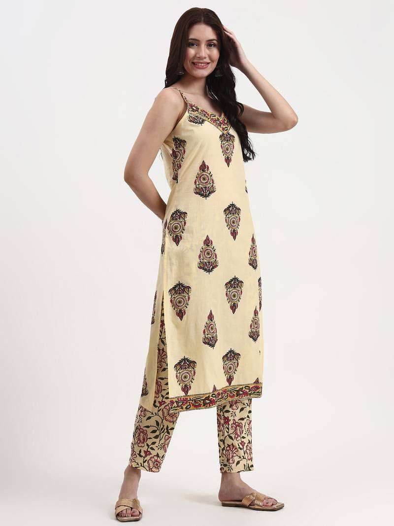 Product Description | Beige Pure Cotton Straight Kurta Trouser Dupatta Set One Pocket Kurta Design Sequins Work Straight Shape Have A Lining, Sleevesles) V Neck Calf Length Kurta Straight Him Machine Weave Pure Cotton Trouser Design: Purple Silk Blend One Pocket Trouser Slip On Waist Size & Fit Material & Care Pure Cotton |