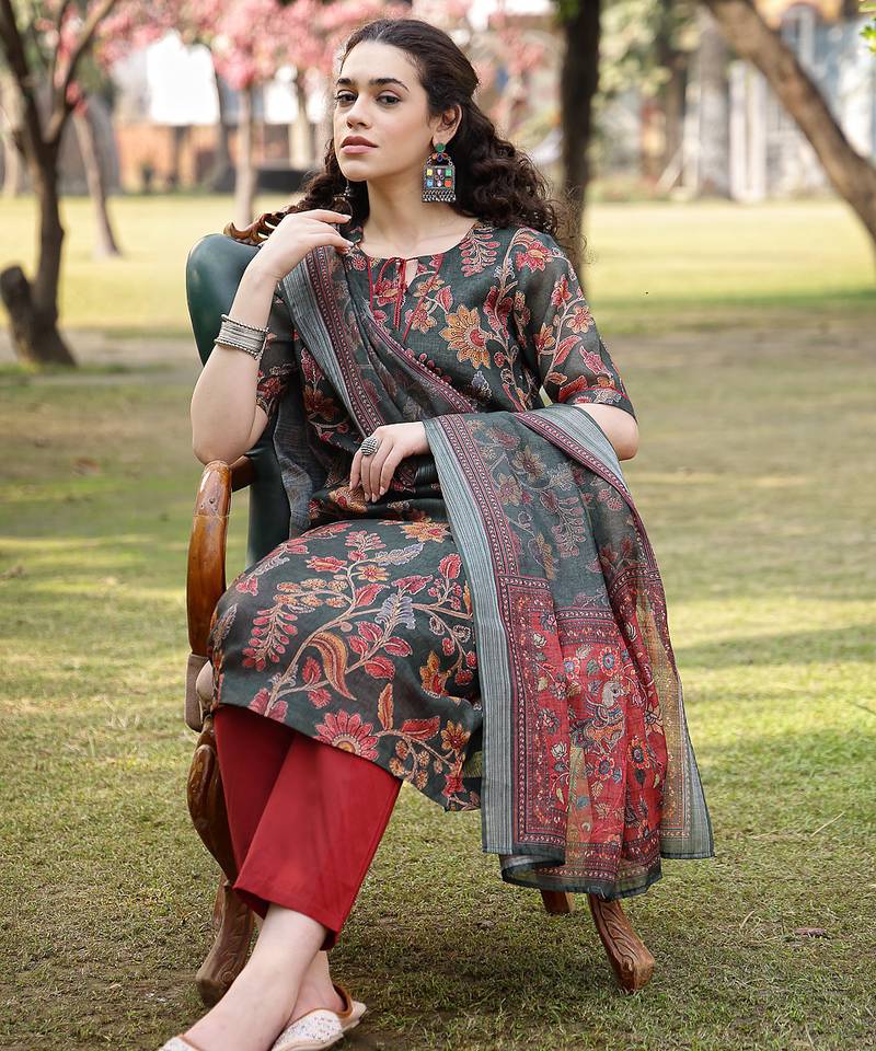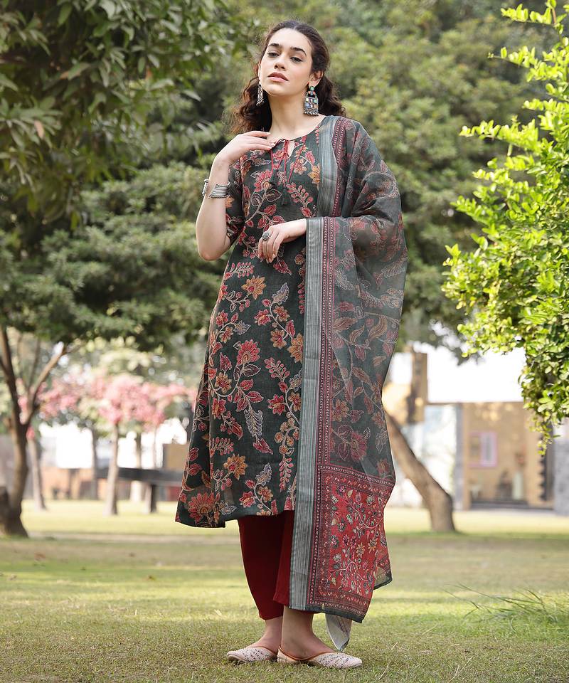 | Product Description | Green Linen Foral Print A Line Show Button Kurta Trouser Dupatta Set Kurta Piping Design Floral A Line Shape Half Sleeve Round Neck Calf Length Kurta Flared Him Machine Weave Linen Trouser Design: Maroon Pure Cotton Trouser Slip On Waist Size & Fit Material & Care Linen |
