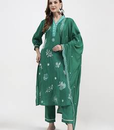 | Product Name | Green Mul Chanderi Thread Work Sequins Work Straight Kurta Trouser Dupatta Set | |