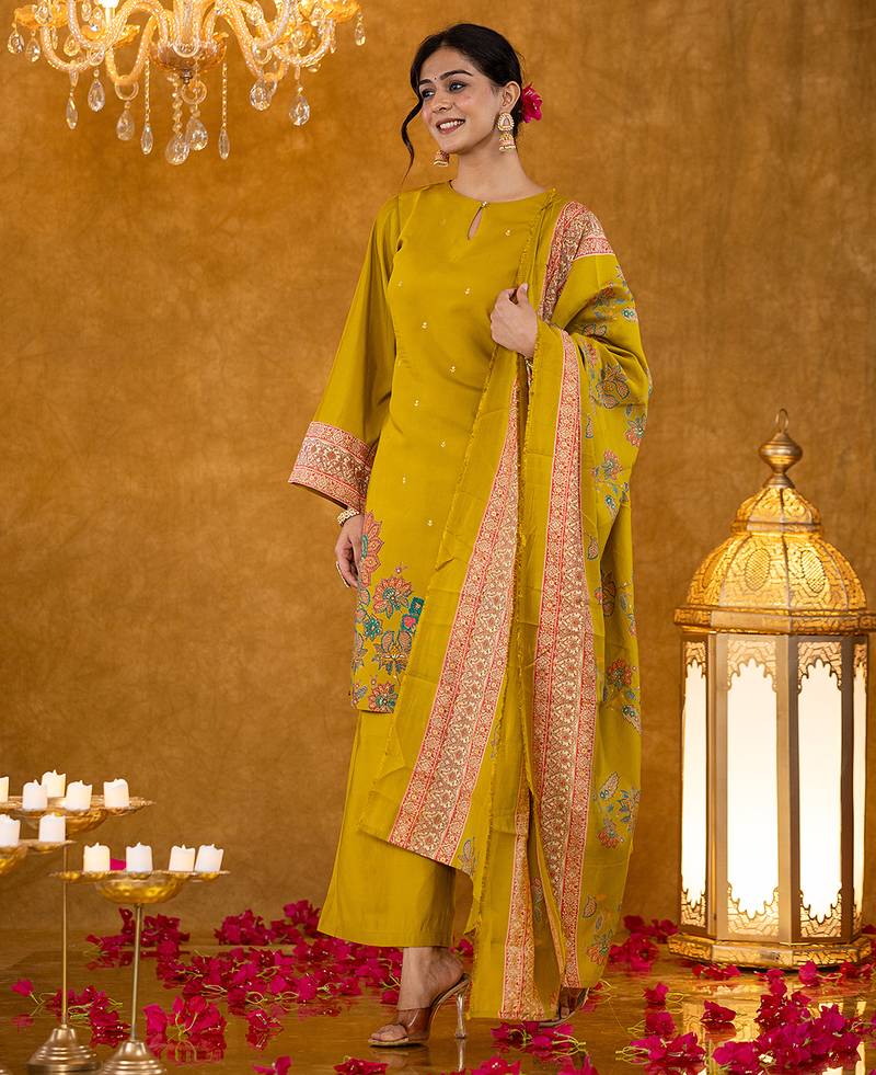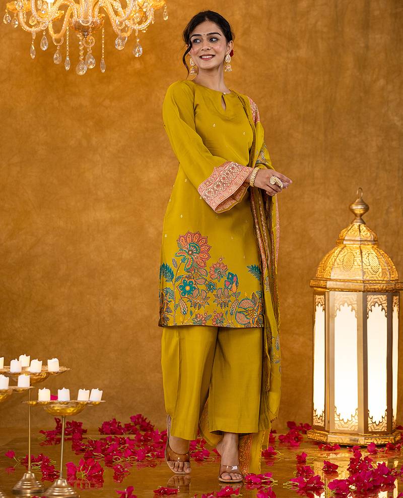 Product Description | Mehndi Green Floral Print Silk Blend Pakistani Style Kurta And Palazzo With Dupatta Kurta Design:Floral Straight Shape Round Neck Long Flared Sleeves) Above Knee Side Slits Kurta Straight Hem,Silk Blend Machine Weave,Palazzo Design:Solid One Pocket Closer Slip On Top Fabric Silk Blend,Bottom Fabric Silk Blend Dupatta Fabric Silk Blend |
