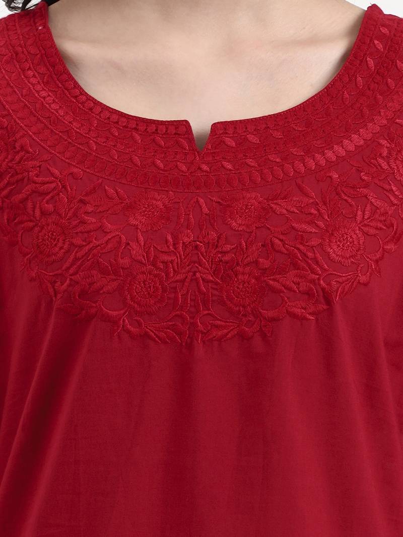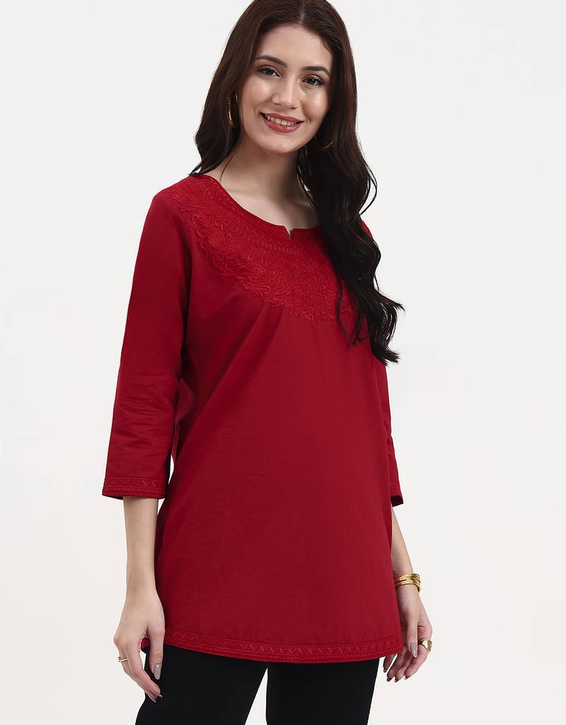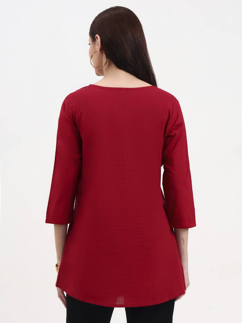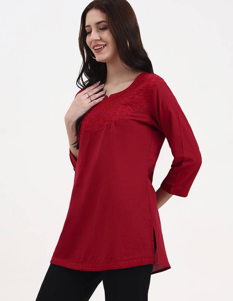 Product Description | Maroon Resham Embroidery Cotton Straight Peplum Top Design Resham Embroidery Peplum Shape Three Quarter Sleeve Round Neck Hip Length Top Straight Him Machine Weave Cotton Full On Waist Size & Fit Material & Care Cotton Hand Wash |