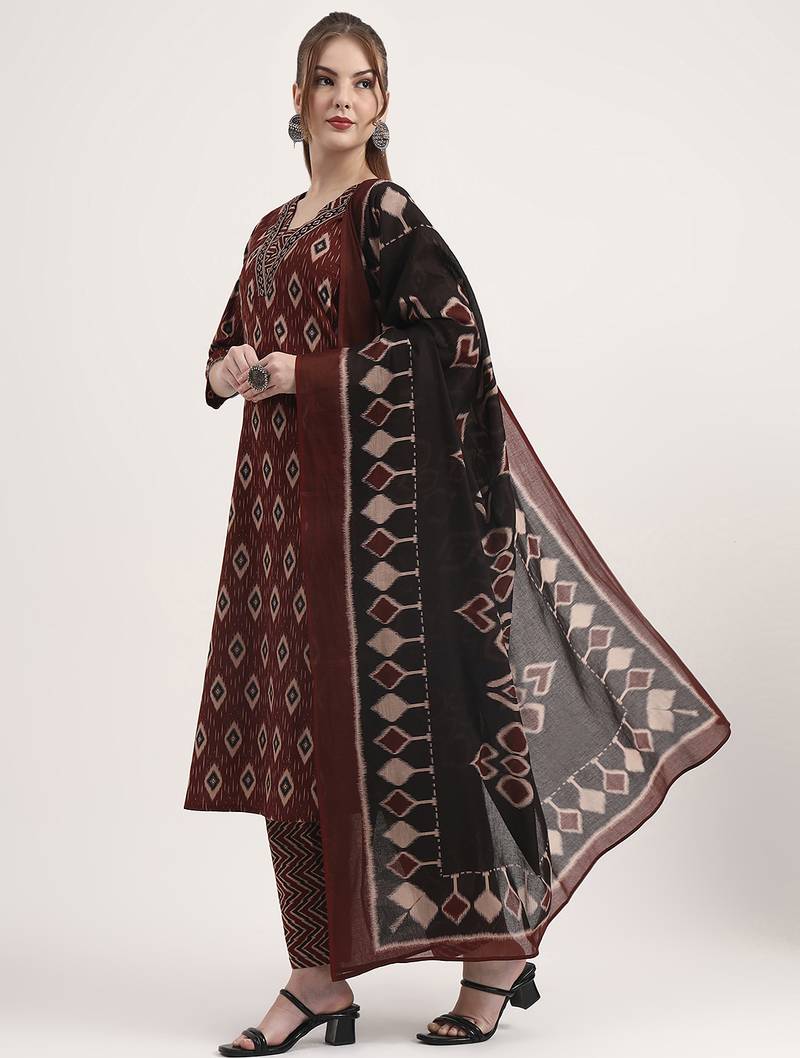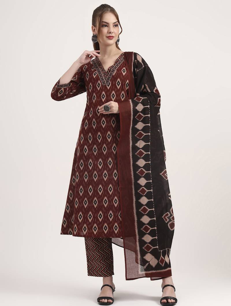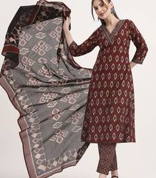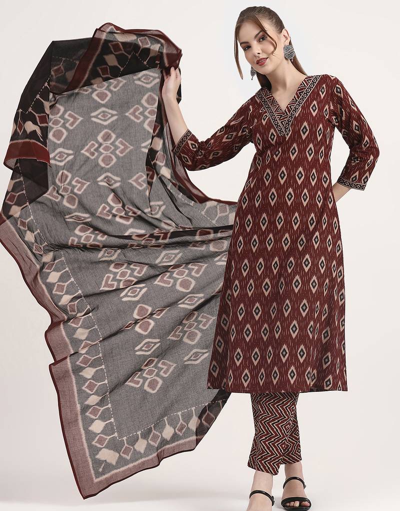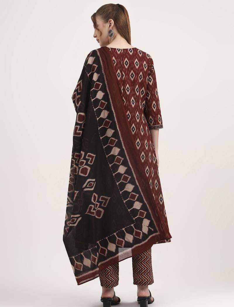 Maroon pure cotton ethnic print a-line kurta trouser dupatta set