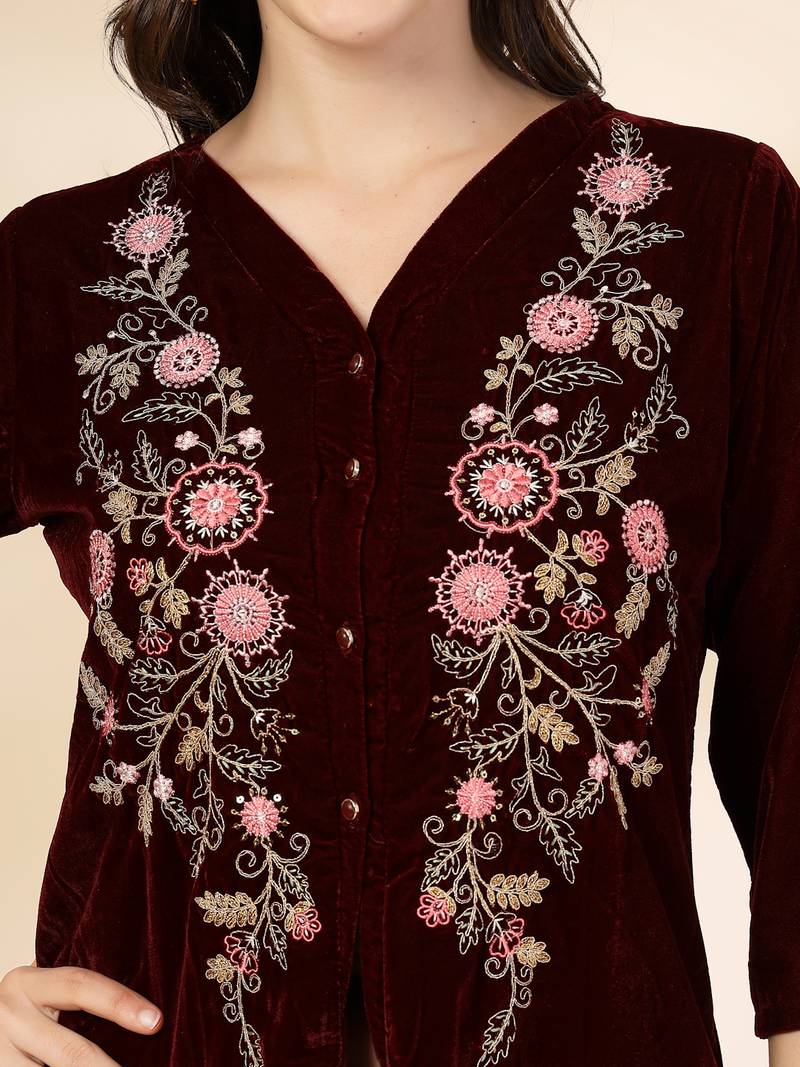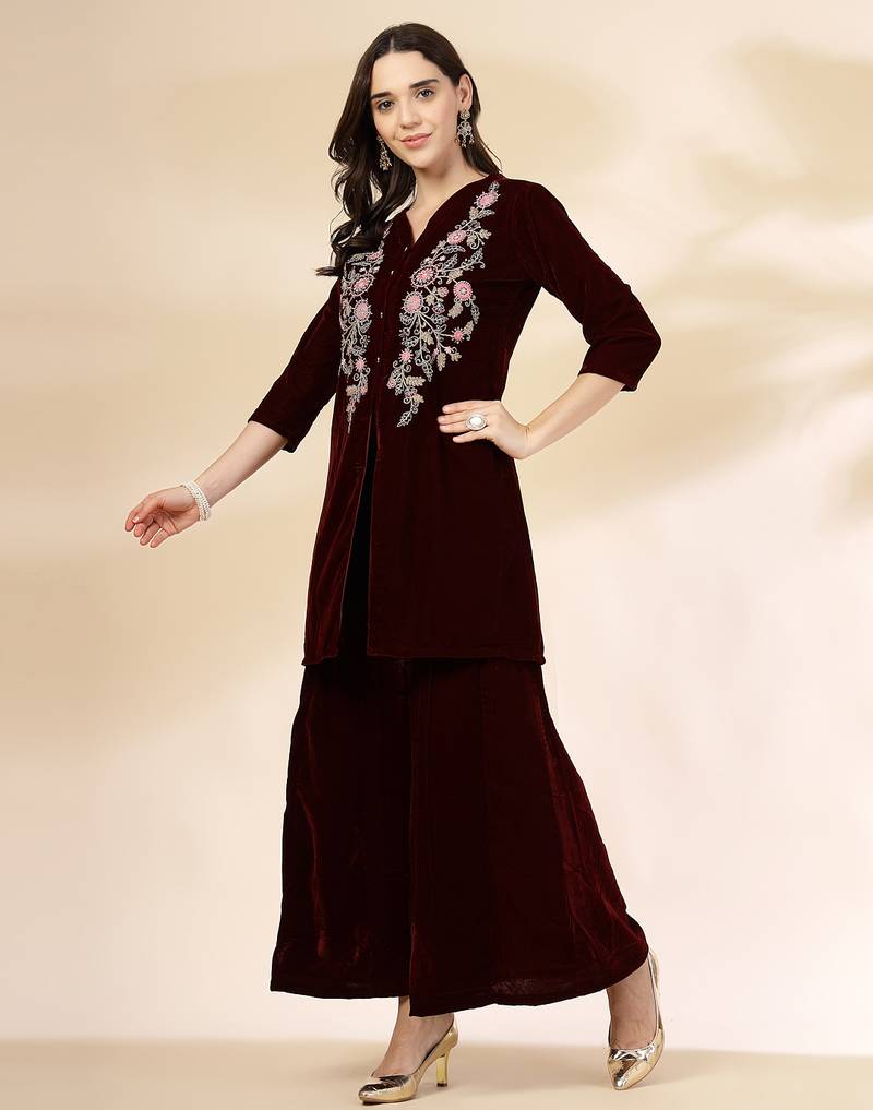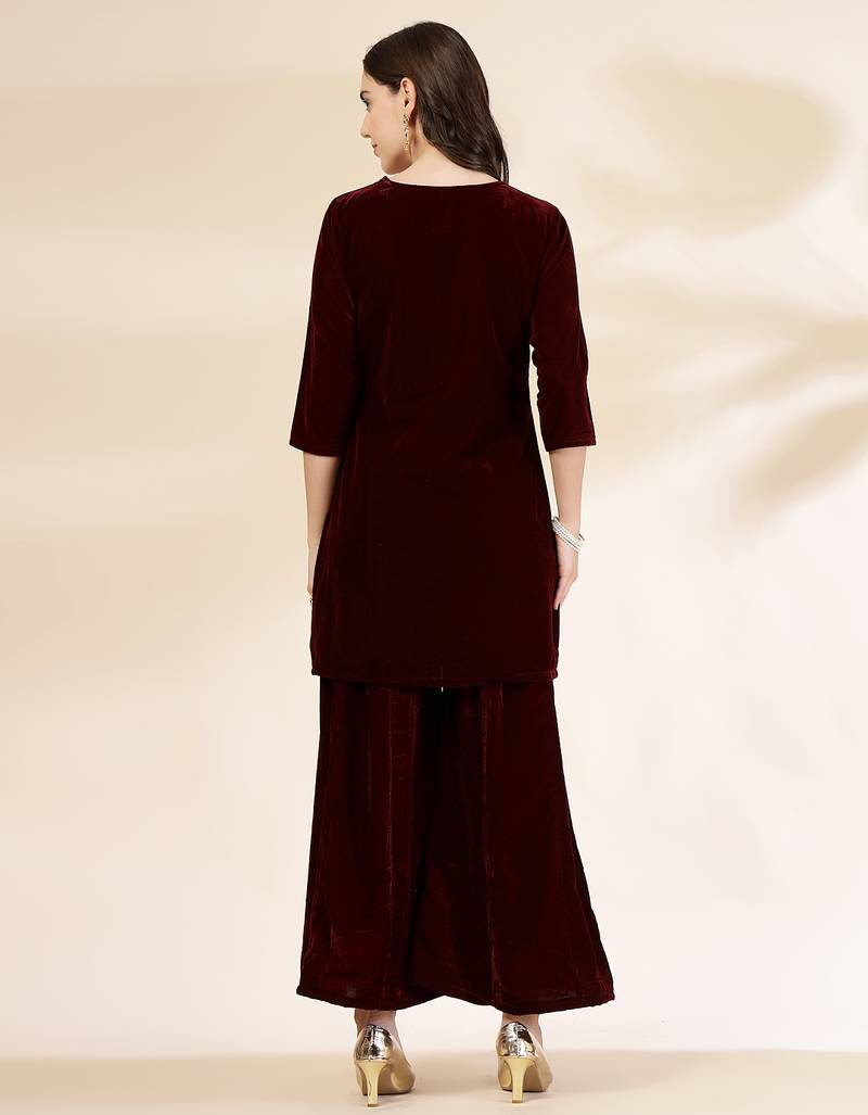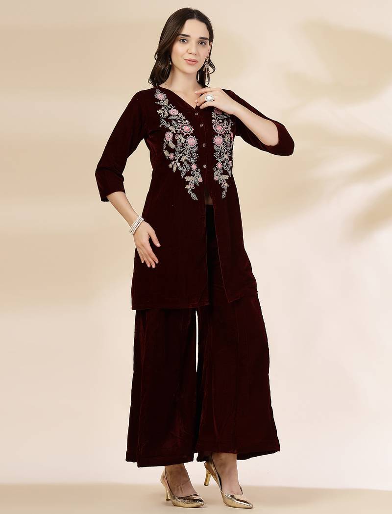 Product Description | Maroon Embroidered Velvet Tunic And Palazzo Co Ord Set Kurta Design:Zari Work Tunic Straight Shape Front Slit Round Neck,Three Quarter Regular Sleeves Straight Hem With Cotton Lining Top Velvet Machine Weave, Palazzo Design:One Pocket Palazzo Elasticated Waistband Slip On Closure Material & Care Top Fabric Velvet Bottom Fabric Velvet |