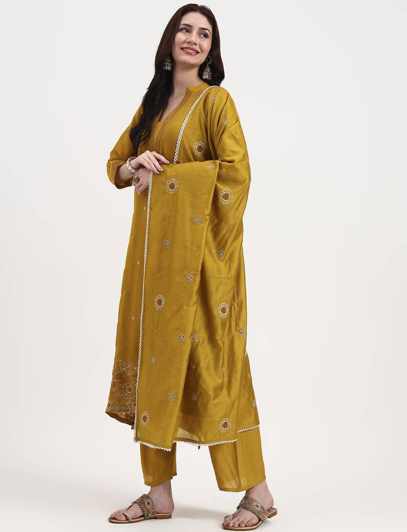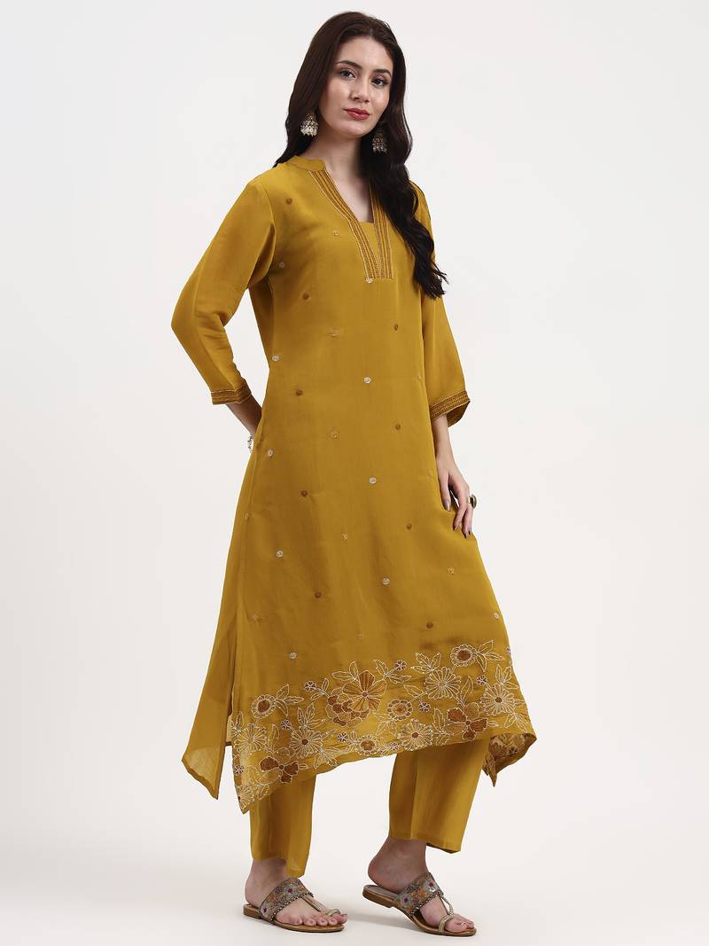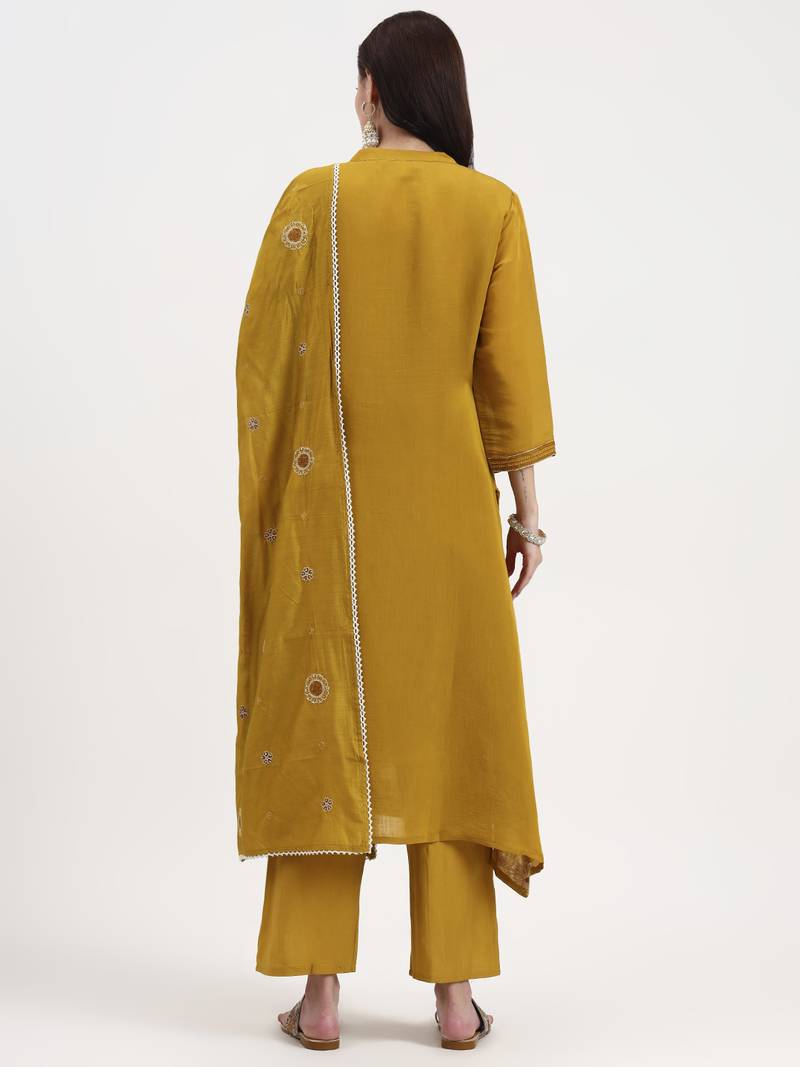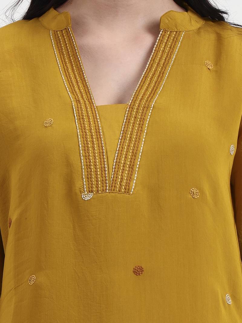 Product Name | Yufta Mustard Kantha Work Chanderi Silk A Line Kurta Trouser Dupatta Set | |