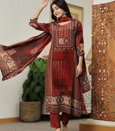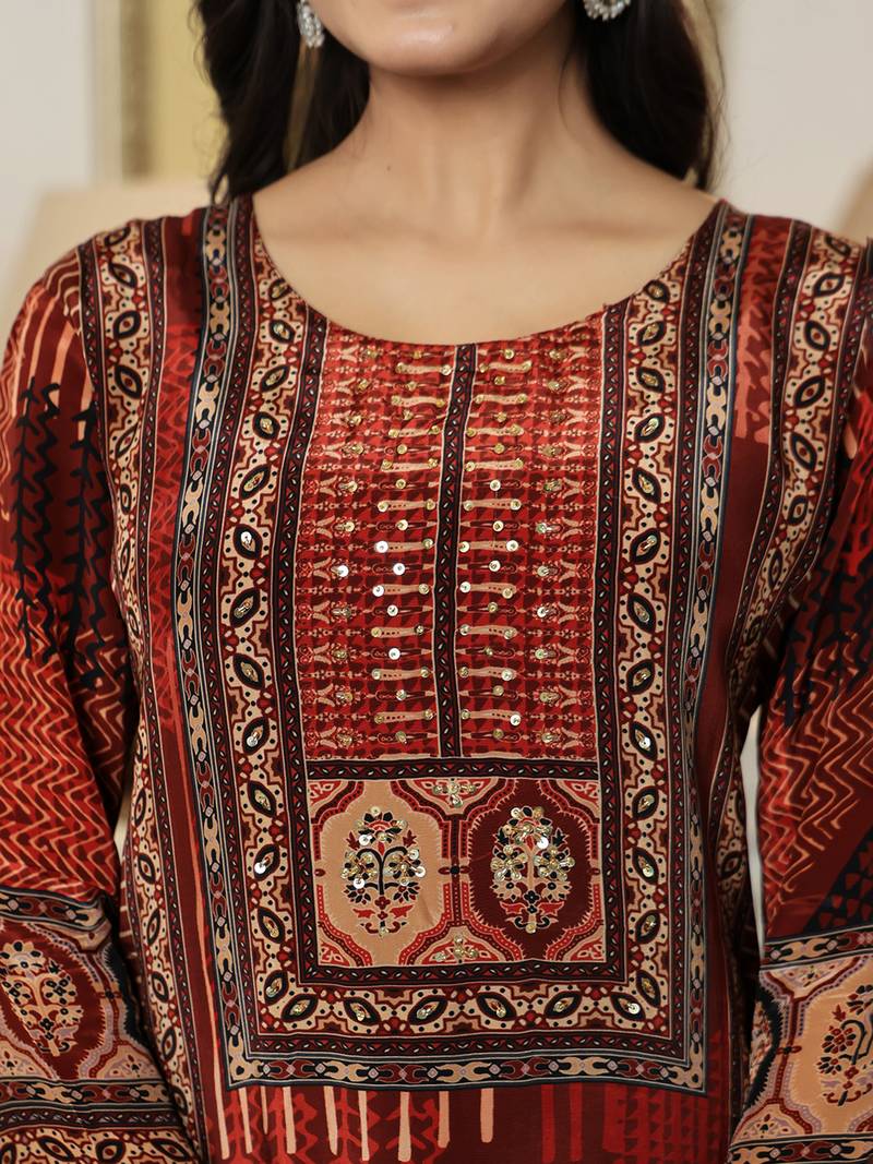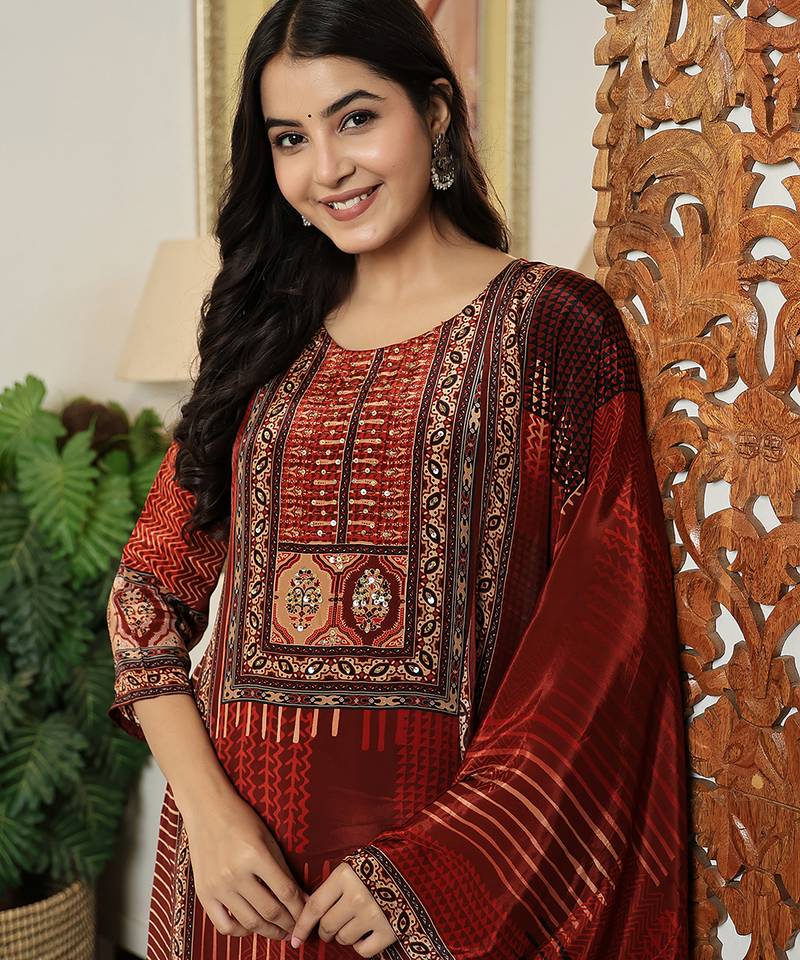 Product Description | Maroon Silk Crepe Ethnic Motifs A Line Kurta Trouser Dupatta Set Have A Lining Kurta Design Sequins Work A Line Shape Side Slits Three Quarter Sleeves Round Neck Calf Length Kurta Straight Him Machine Weave Silk Crepe Trouser Design: Maroon Pure Cotton Trouser Slip On Waist Size & Fit Material & Care Silk Crepe |