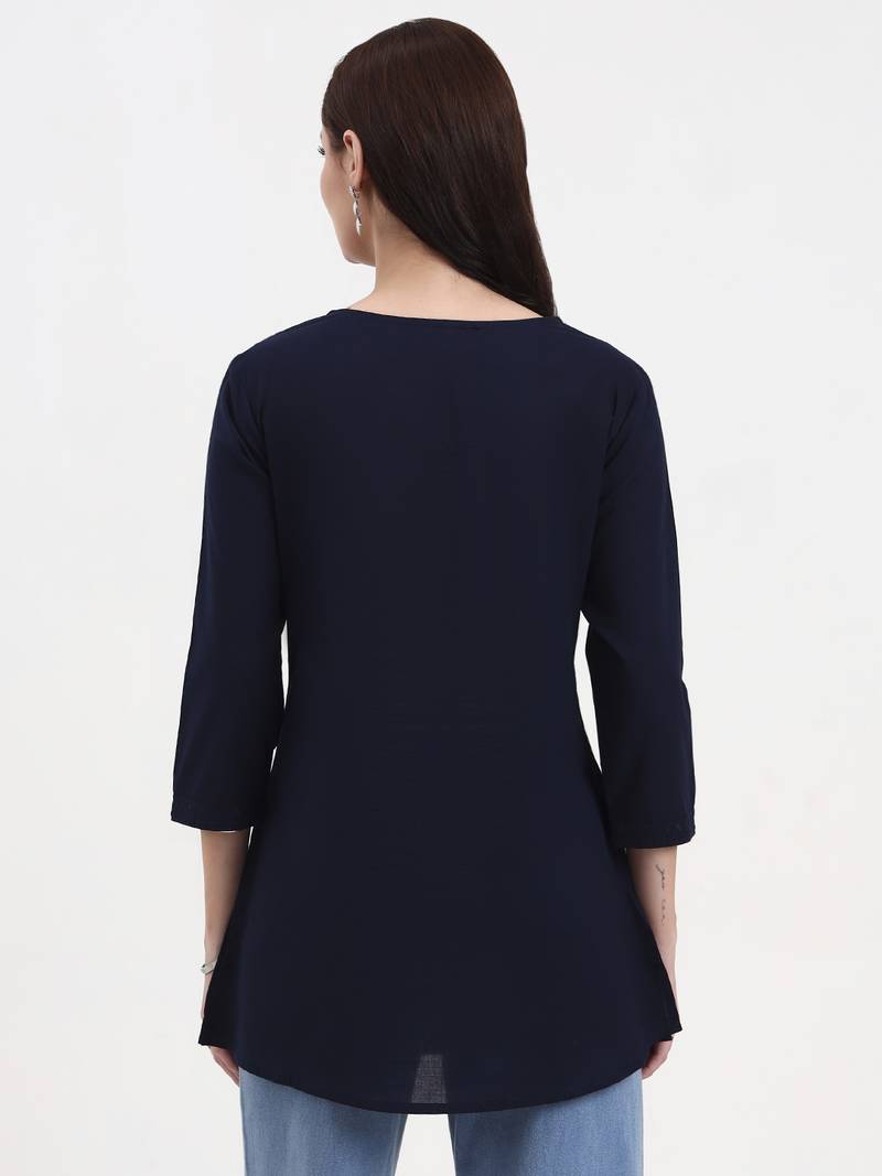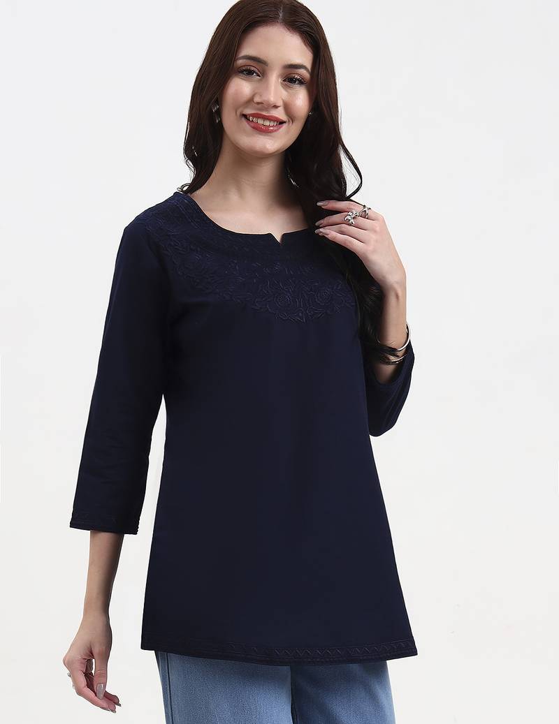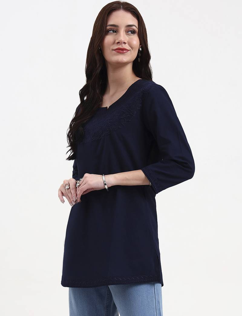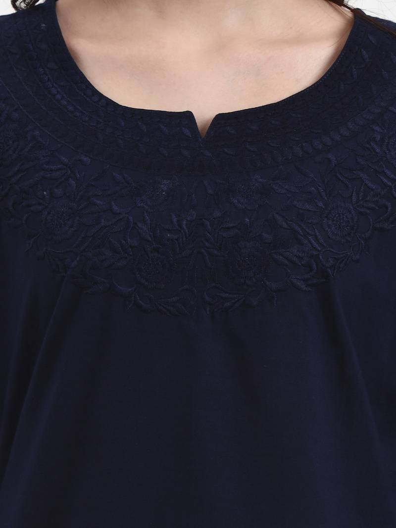 Product Description | Navy Blue Resham Embroidery Cotton Straight Peplum Top Design Resham Embroidery Peplum Shape Three Quarter Sleeve Round Neck Hip Length Top Straight Him Machine Weave Cotton Full On Waist Size & Fit Material & Care Cotton Hand Wash |
