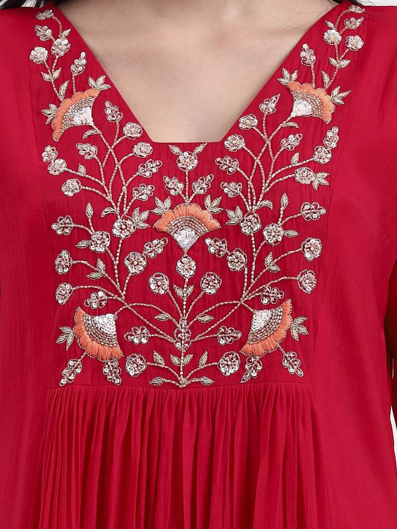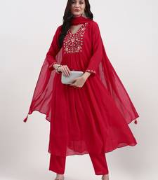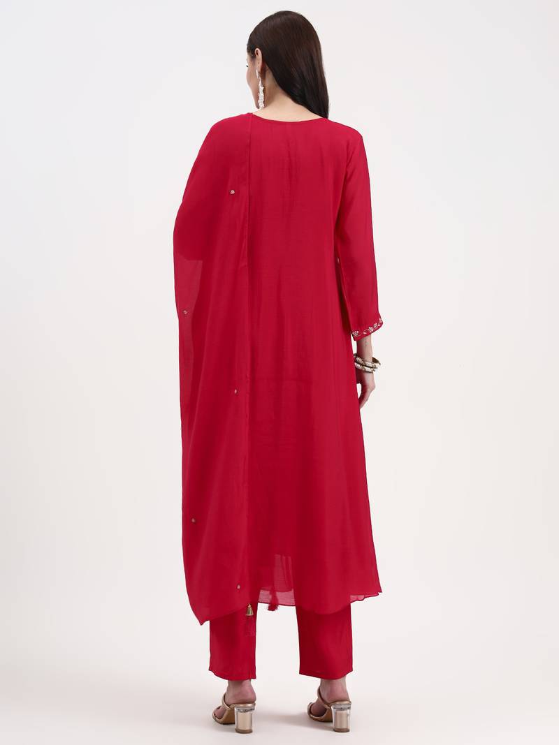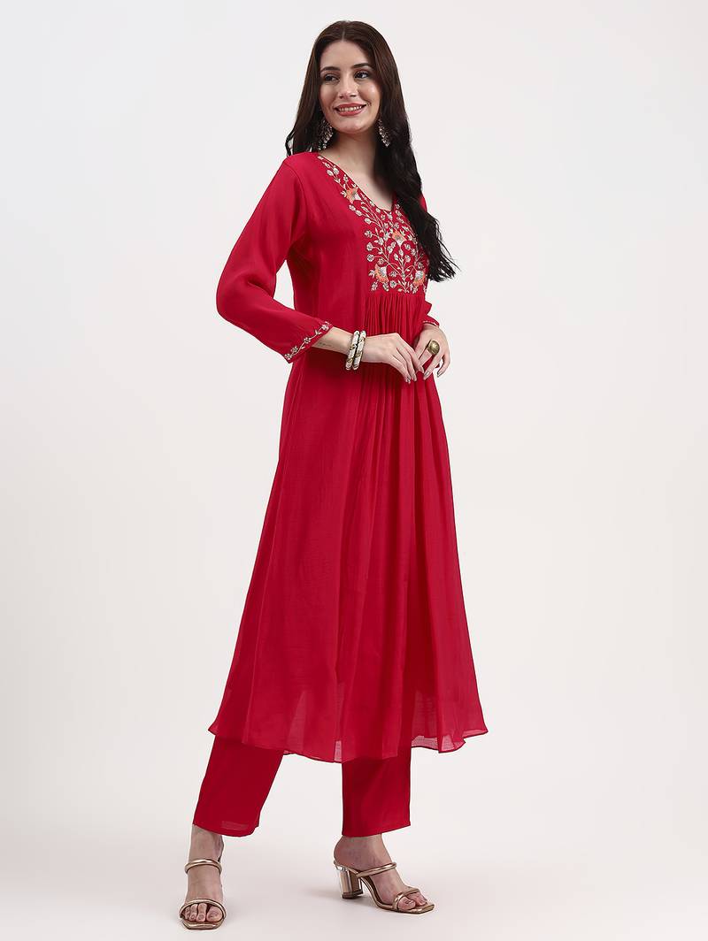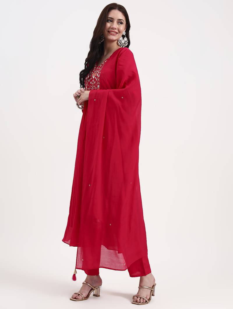 Product Name | Yufta Pink Embroidered Chanderi Silk A Line Kurta Trouser Dupatta Set | |