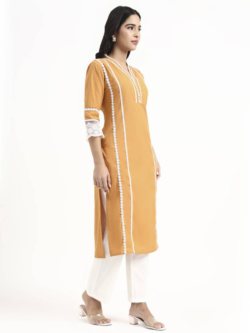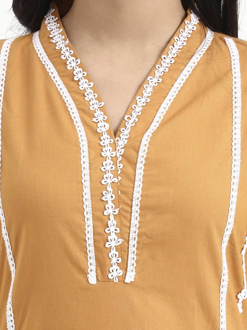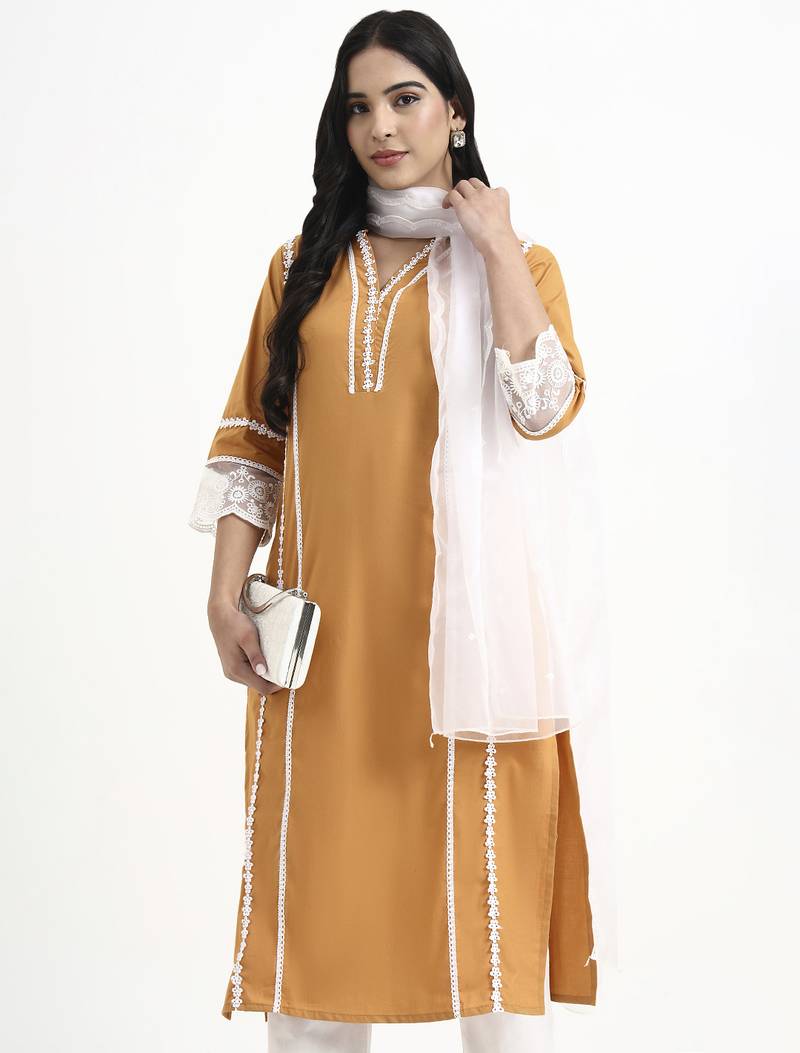 | Product Description | Bronze Lace Work Straight Organic Cotton Yoke Design Poplin Kurta Trouser Dupatta Set Kurta Design Solid Lace Work Straight Shape Side Slits Three Quarter Regular Sleeves V Neck Calf Length Kurta Straight Him Machine Weave Cotton Trouser Design:Solid One Pocket Trouser Half Elastic Waist Dupatta White Organic Scalloped Border Size & Fit Material & Care Organic Cotton Dry Clean |