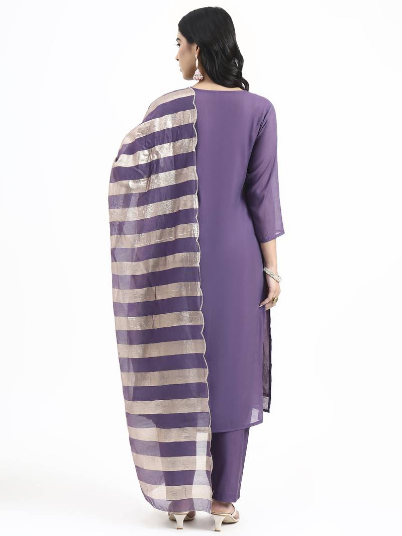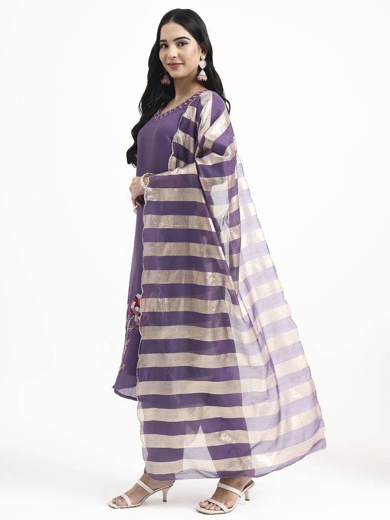 | Product Name | Yufta Purple Solid Straight Style Chanderi Silk Lining Kurta Trouser Dupatta Set | |