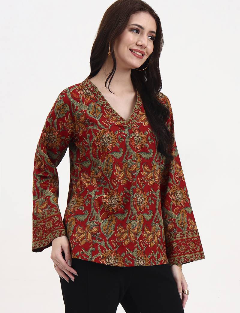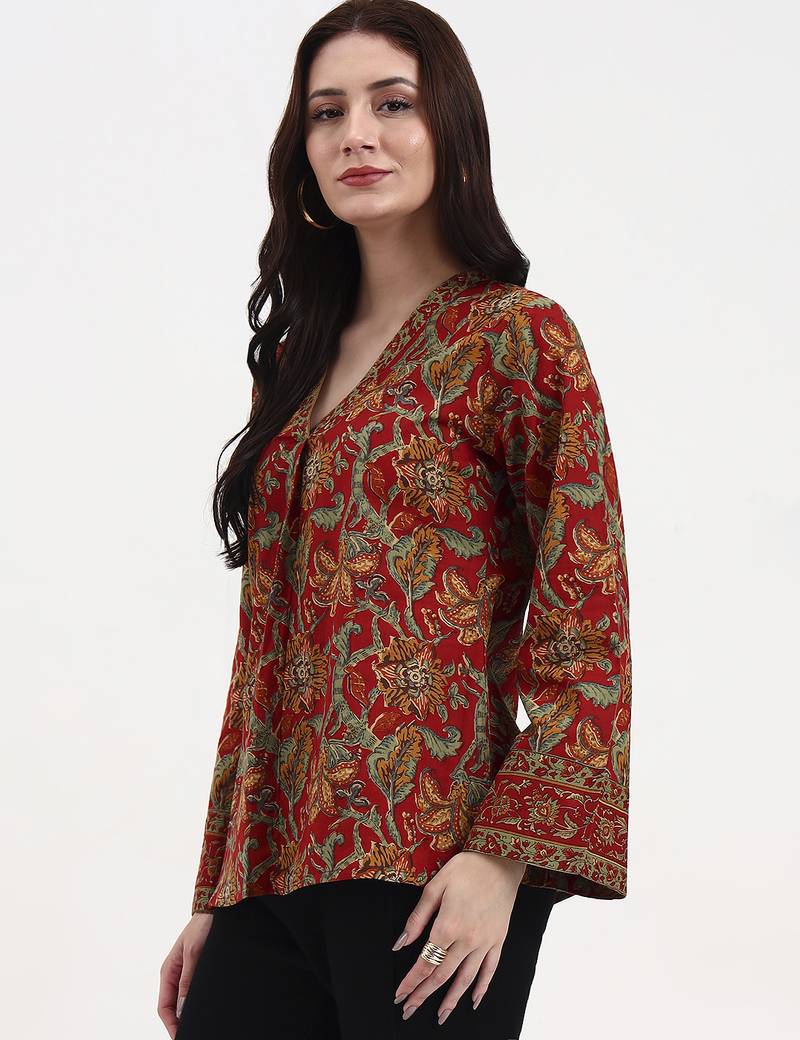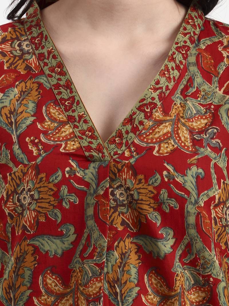 Product Description | Red And Green Floral Cotton Straight Peplum Top Design Peplum Shape Long Sleeve(Regular Sleeves) V Neck Peplum Length Top Straight Him Machine Weave Cotton Full On Waist Size & Fit Material & Care Cotton Hand Wash |