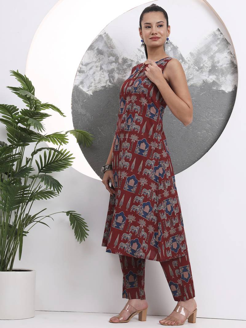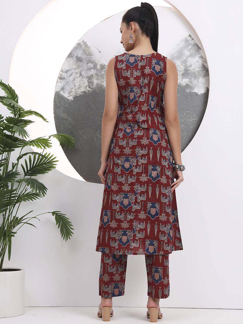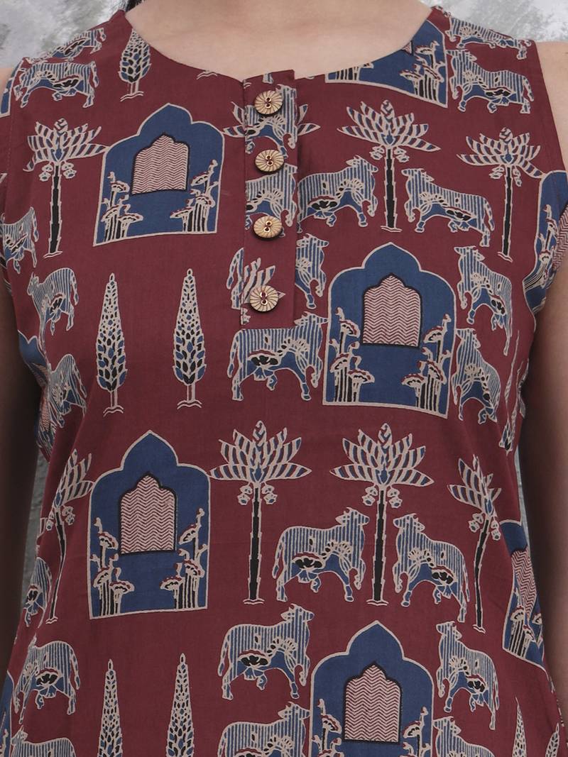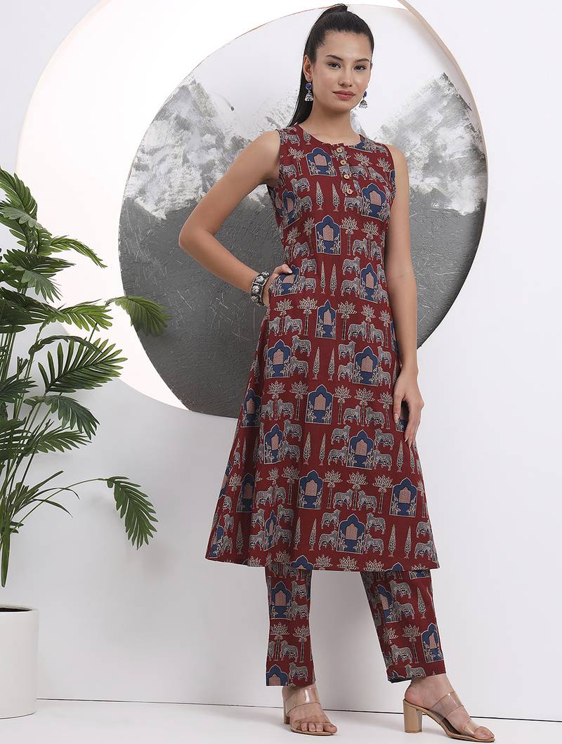 Product Description | Rust Animal Print Aline Pure Cotton Kurta Trouser Set One Side Pocket Kurta Design Button Show On Yoke A Line Shape Sleeveless Round Neck Calf Length Kurta Flared Him Machine Weave Pure Cotton Trouser Design:Pure Cotton Trouser Slip On Waist Size & Fit Material & Care Pure Cotton Dry Clean |
