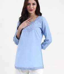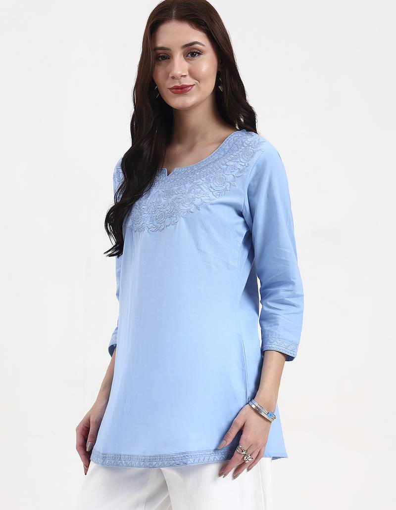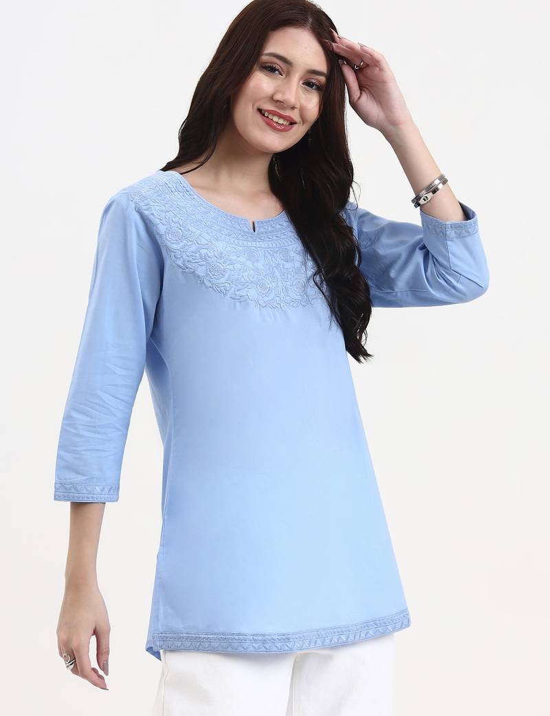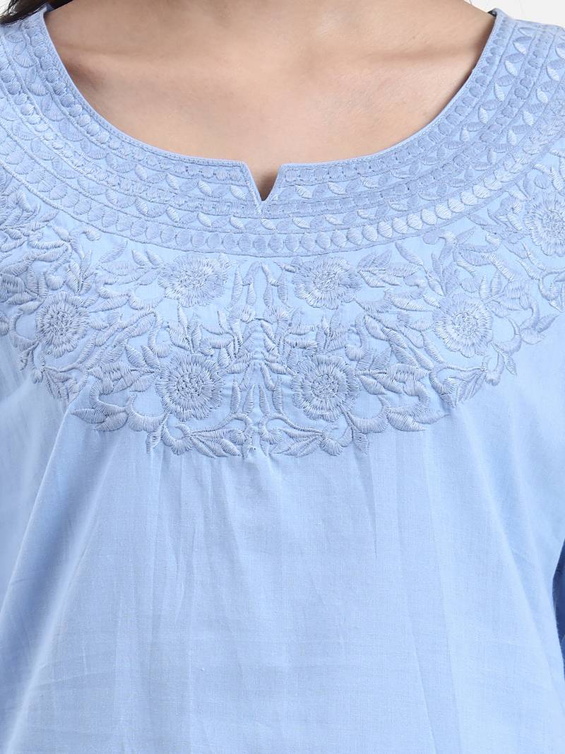 Product Description | Blue Resham Embroidery Cotton Straight Peplum Top Design Resham Embroidery Peplum Shape Three Quarter Sleeve Round Neck Hip Length Top Straight Him Machine Weave Cotton Full On Waist Size & Fit Material & Care Cotton Hand Wash |