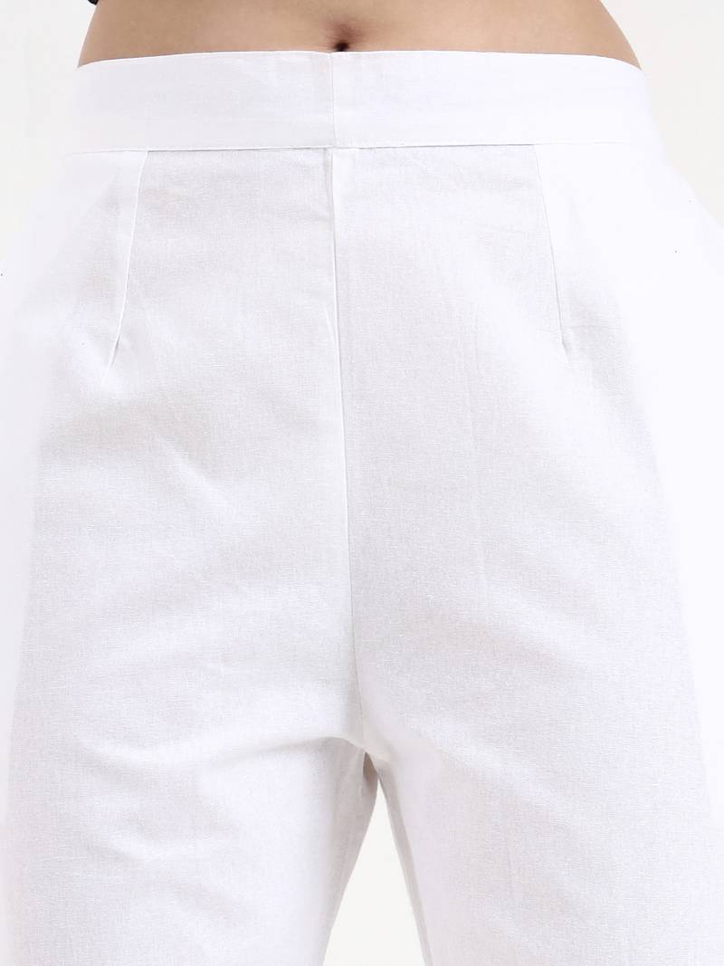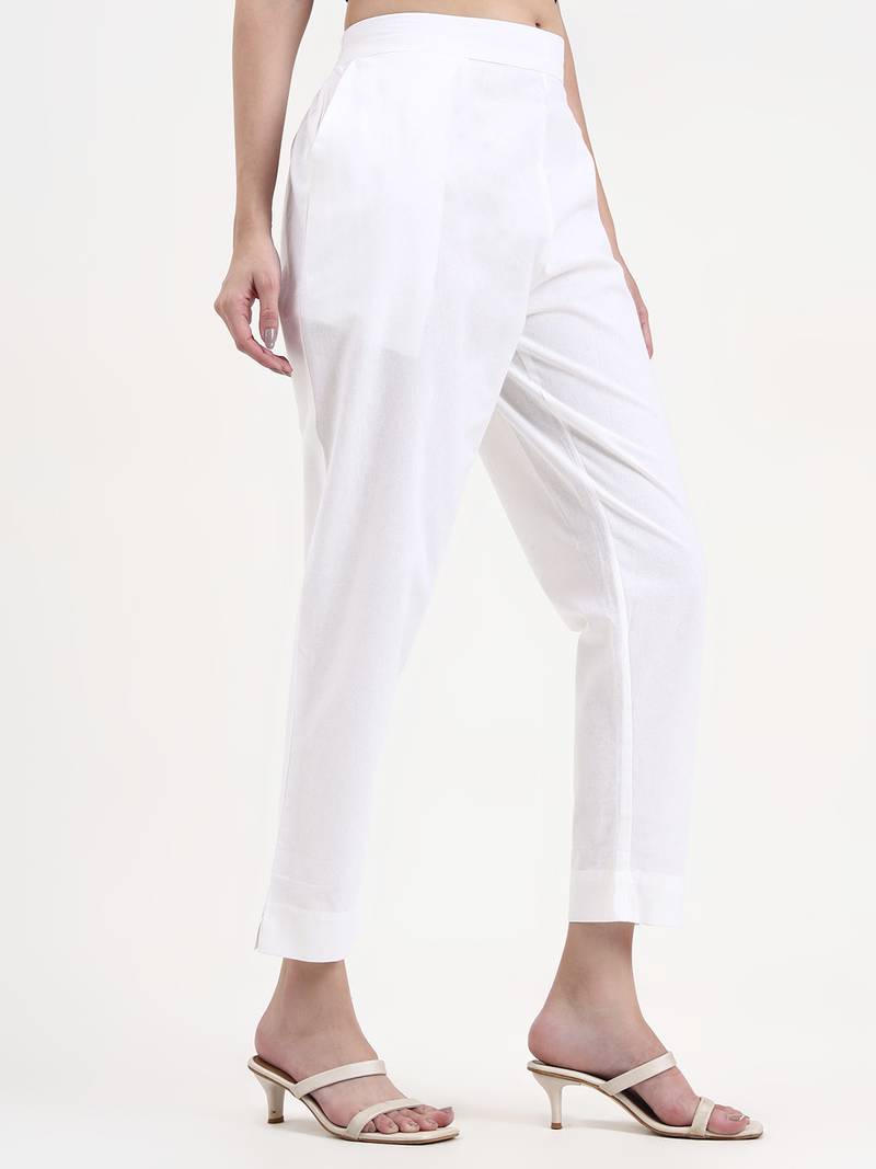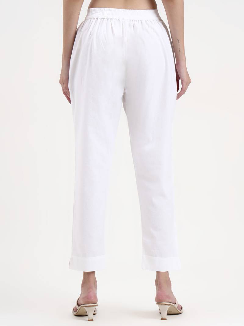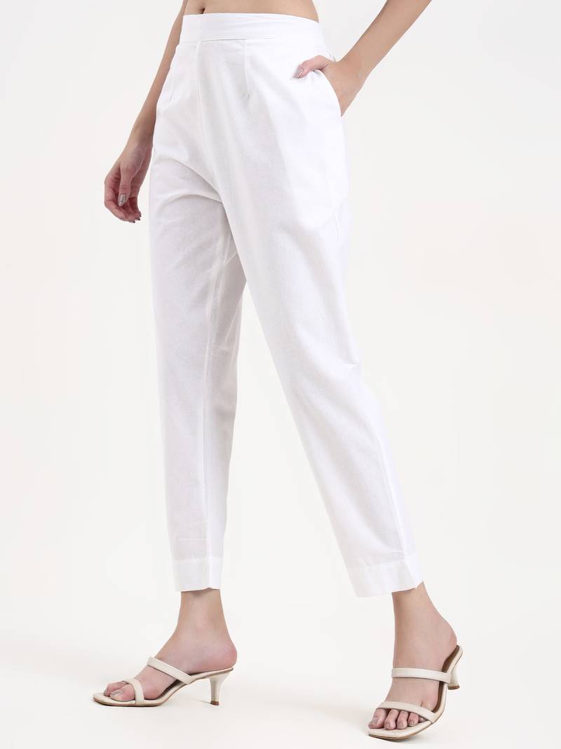 Product Description | White Woven Trousers Slim Fit Mid Rise Length: Regular Pattern: Solid Flat Front, With No Pleats Design Feature: Plain 2 Pockets Size & Fit Fit: Slim Fit Material & Care 100% Cotton Hand Wash |