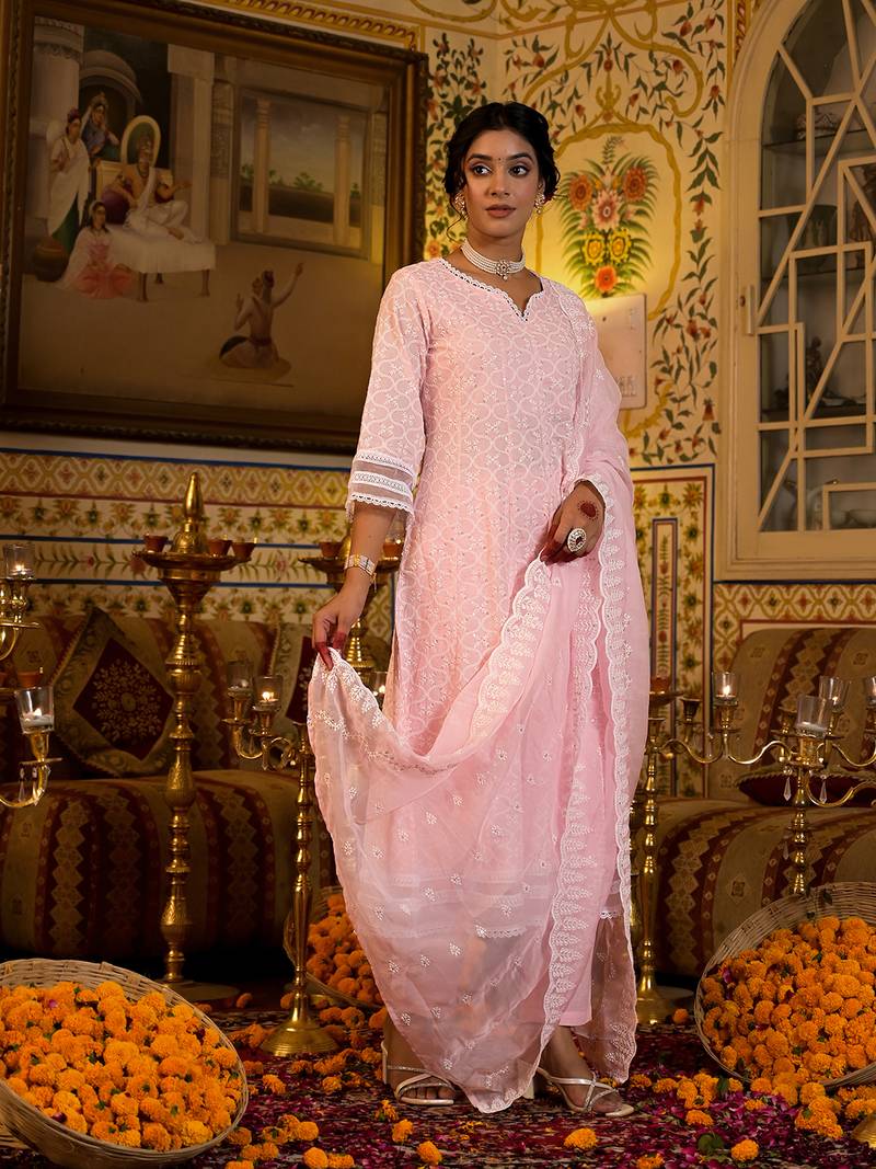 | Product Description | Pink Embroidered Anarkali Kurta Trouser With Dupatta Set,Kurta Design:Sequence Work,Lace Work,Chikankari Work Anarkali Shape Has A Lining Three Quarter Sleeve(Flared Sleeves) Sweetheart Neck Calf Length Pure Cotton No Slits Kurta With Flared Hem Pure Cotton Machine Weave Fabric Trouser Design: Solid Trouser ,Chikankari Work Organza Dupatta Border Slip On Waist Size & Fit Material & Care Pure Cotton Dry Clean |