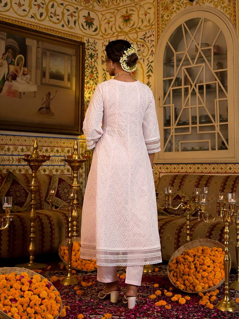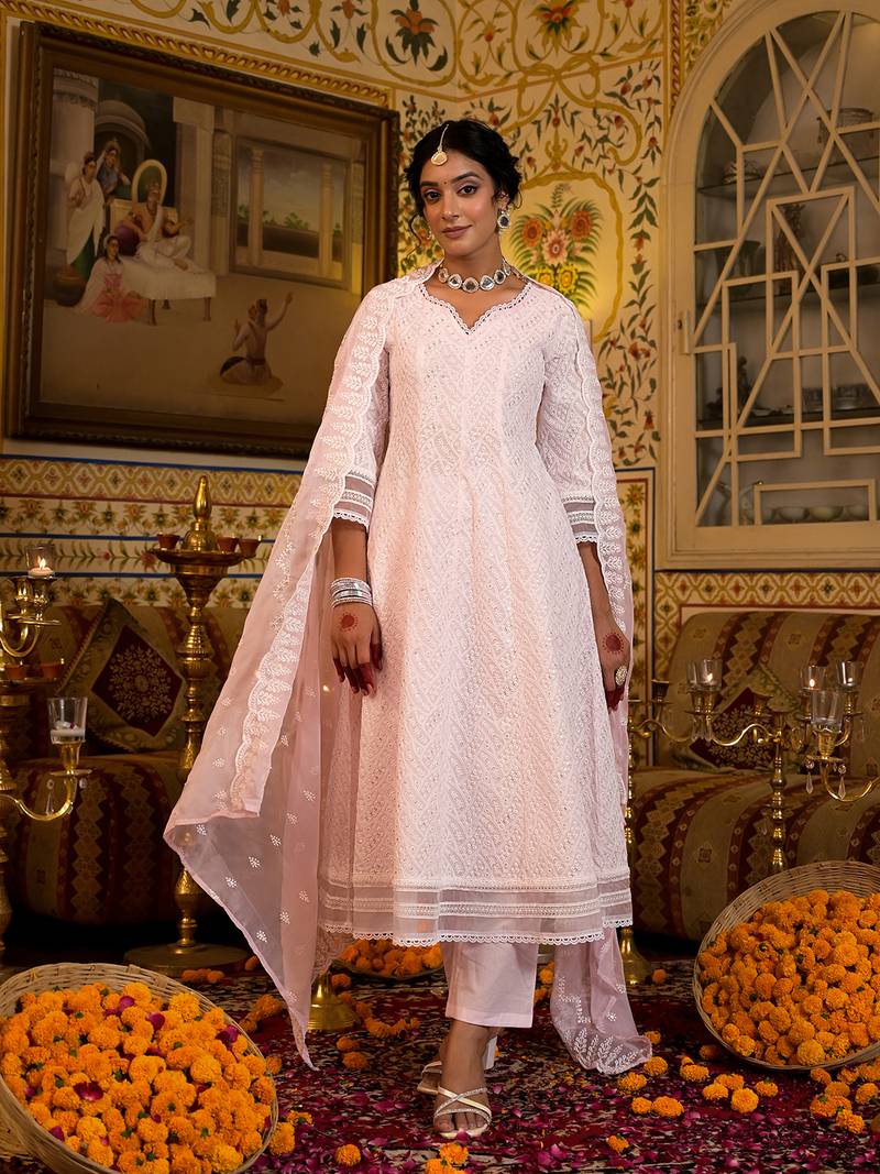 | Product Description | Pink Embroidered Anarkali Kurta Trouser With Dupatta Set,Kurta Design:Angrakha Sequence Work,Lace Work,Chikankari Work Anarkali Shape Has A Lining Three Quarter Sleeve(Flared Sleeves) Sweetheart Neck Calf Length Pure Cotton No Slits Kurta With Flared Hem Pure Cotton Machine Weave Fabric Trouser Design: Solid Trouser ,Chikankari Work Organza Dupatta Border Slip On Waist Size & Fit Material & Care Pure Cotton Dry Clean |