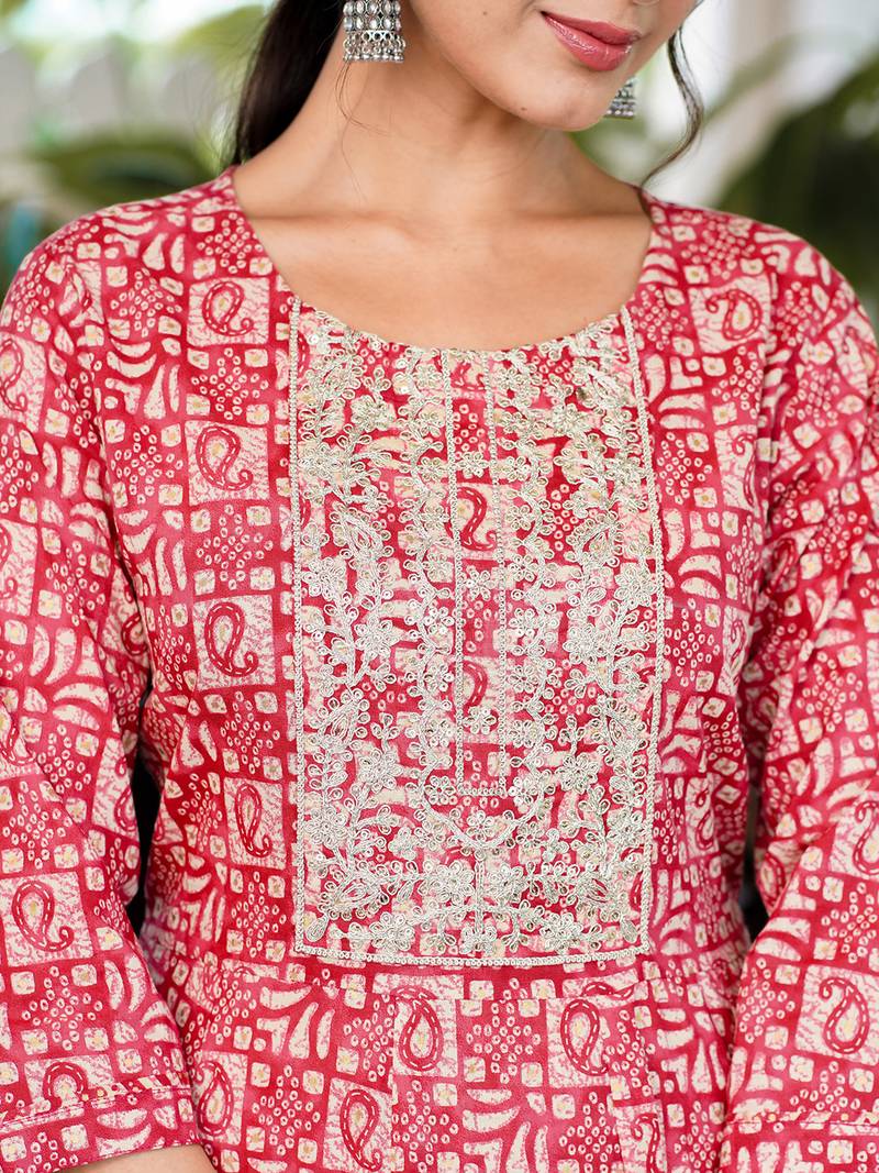 | Product Description | Red Ethnic Motifs Kurta With Trousers With Dupatta Kurta Design: Zari Work Anarkali Shape Regular Style Round Neck, Three Quarter Regular Sleeves 1 Pockets Sequinned Detail Calf Length With Flared Hem Pure Cotton Machine Weave Fabric Trouser Design: Printed Trouser Elasticated Waistband Slip On Closure Dupatta Design: Printed Dupatta Material & Care 100% Cotton Hand Wash |