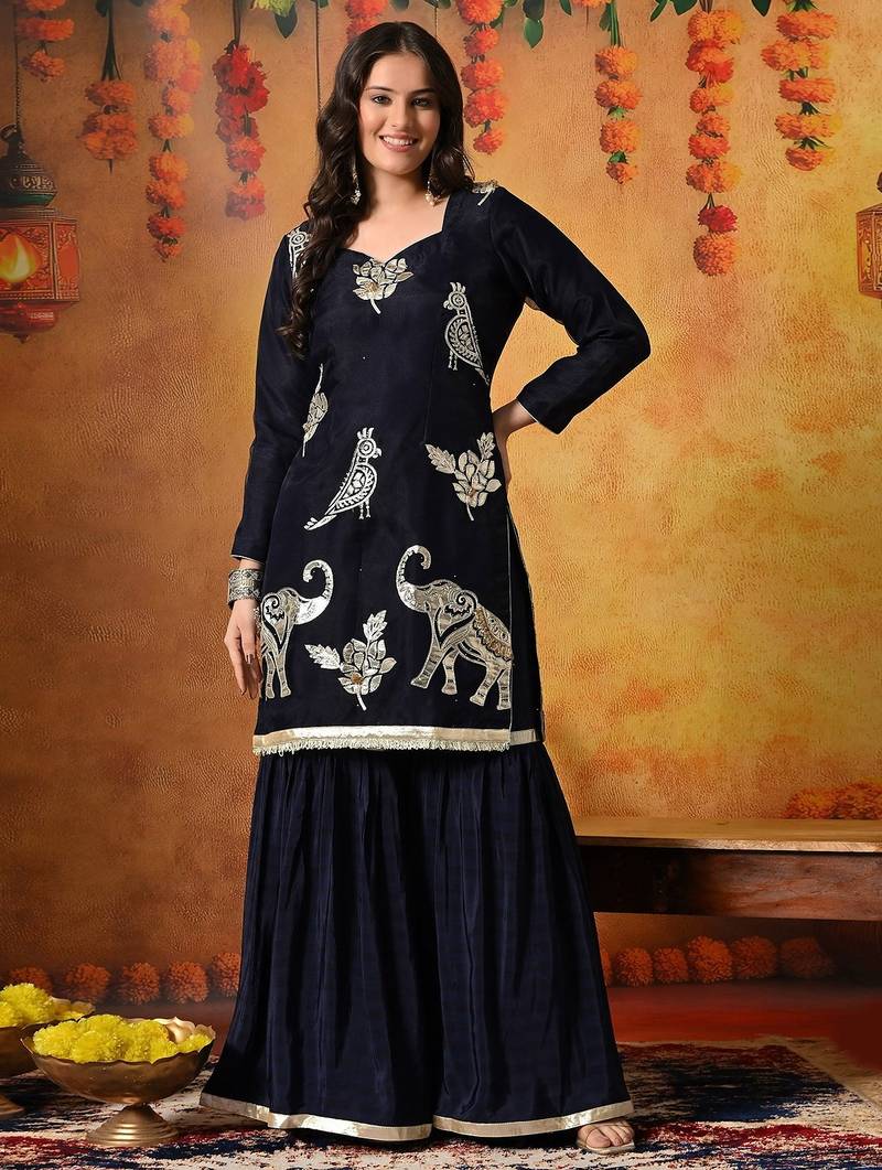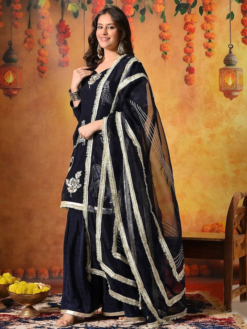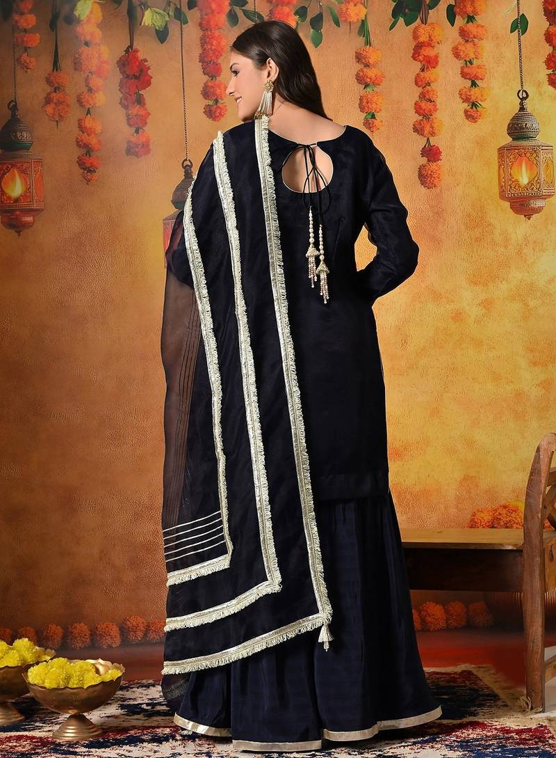 | Product Description | This Elegant Navy Blue Gharara Set Is Designed To Bring Effortless Sophistication To Festive And Wedding Celebrations. Crafted With A Graceful Blend Of Tissue Organza And Crepe, The Ensemble Features A Beautifully Tailored Kurta, Flared Gharara, And Matching Dupatta, Creating A Refined And Contemporary Ethnic Silhouette. |