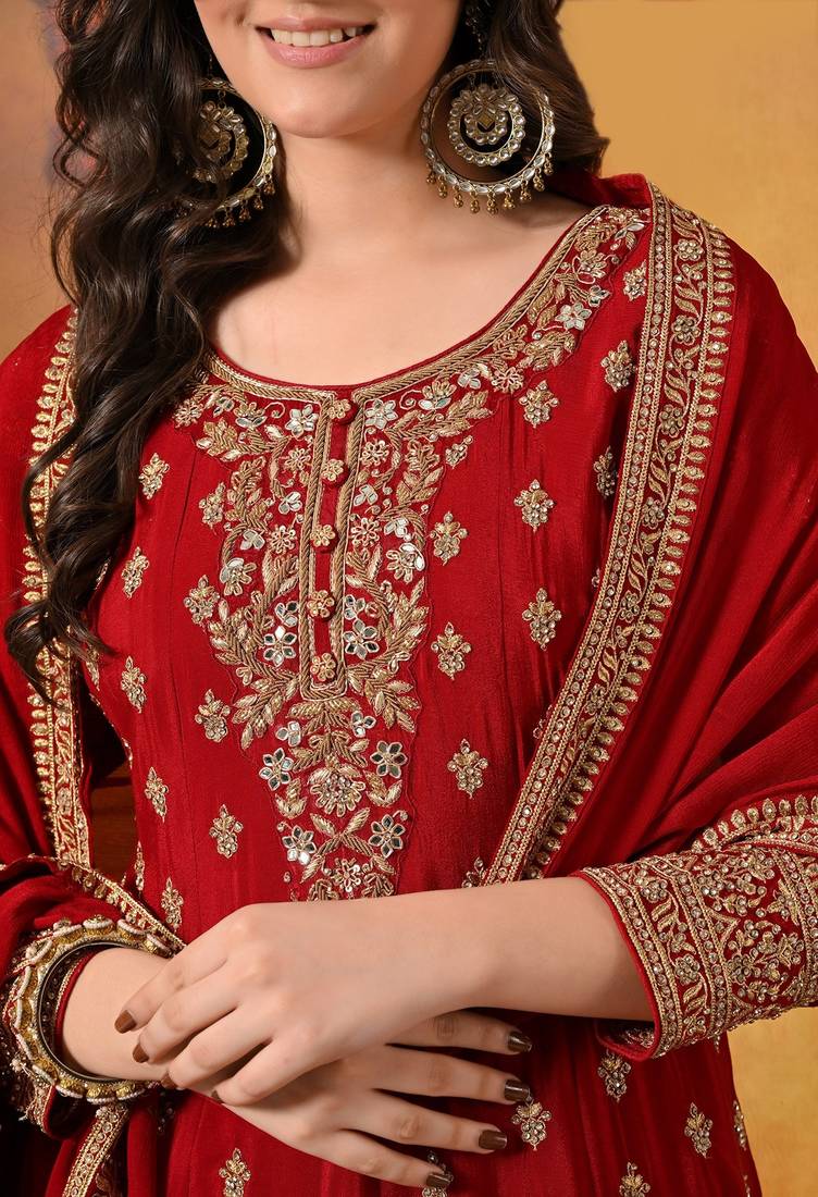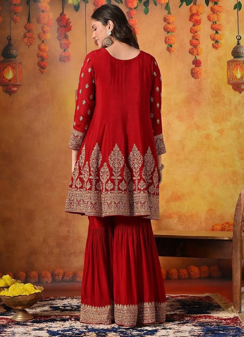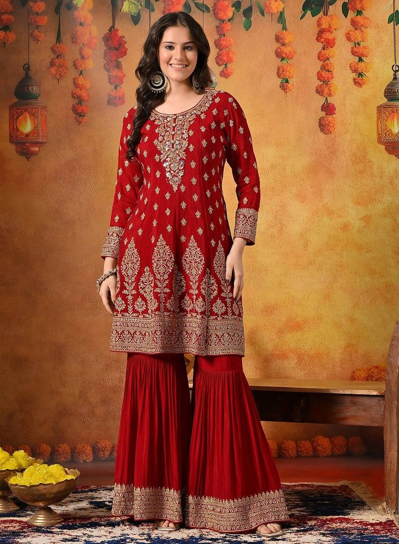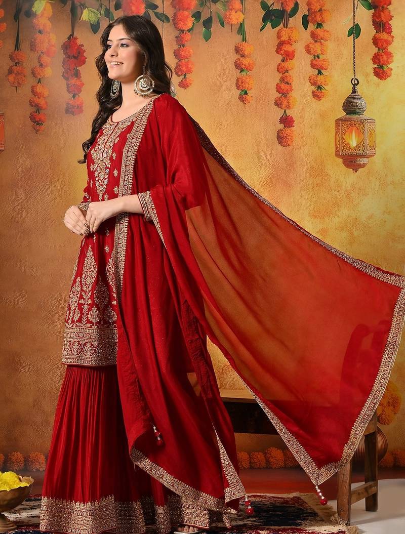 | Product Description | This Exquisite Maroon Gharara Set Is A Perfect Blend Of Traditional Craftsmanship And Festive Elegance. Crafted In Luxurious Chinon Fabric, The Ensemble Features A Beautifully Tailored Kurti, Flared Gharara, And Matching Dupatta, Creating A Regal And Graceful Ethnic Silhouette. |