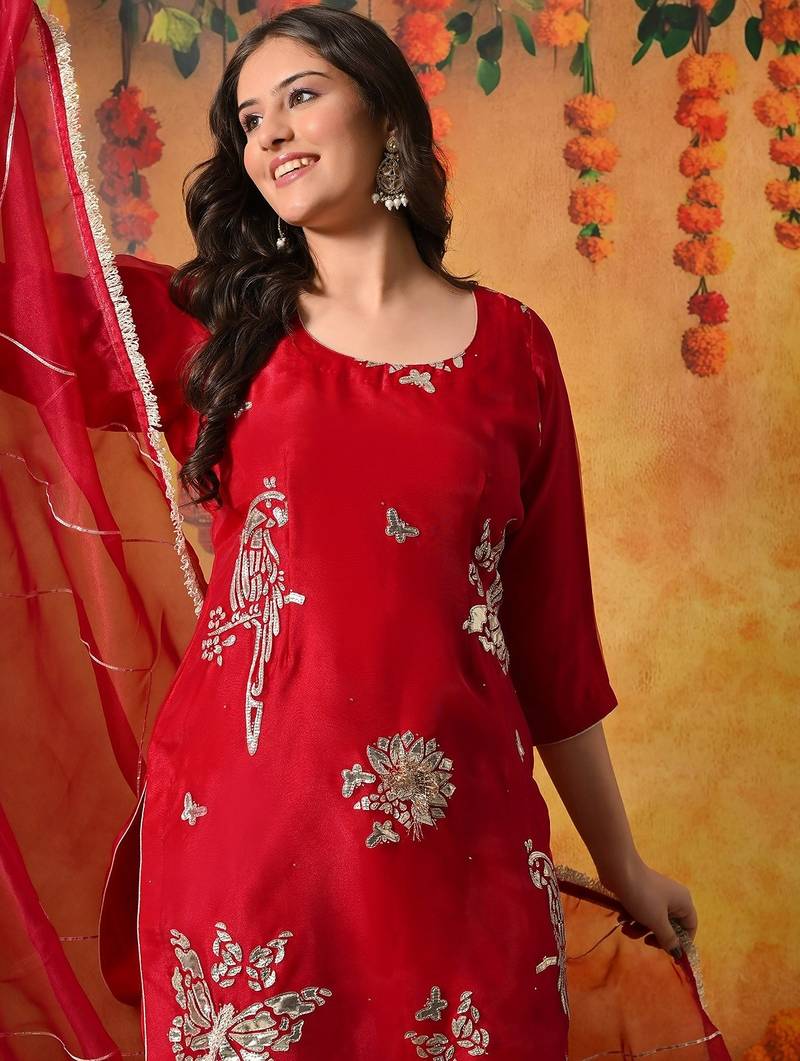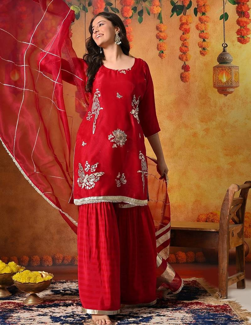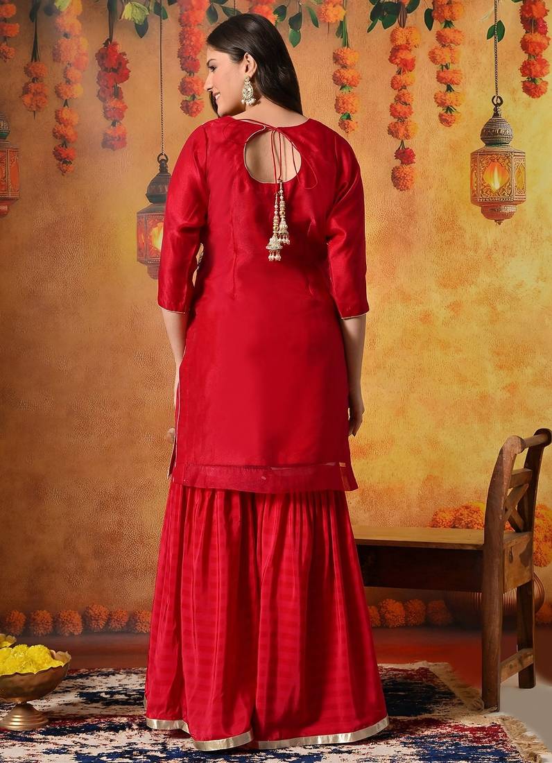 | Product Description | This Charming Reddish Pink Gharara Set Is Designed To Bring A Graceful And Festive Appeal To Special Occasions. Crafted In A Delicate Combination Of Tissue Organza And Crepe, The Ensemble Includes A Beautifully Tailored Kurta, Flared Gharara, And Matching Dupatta, Creating A Soft And Elegant Traditional Silhouette. |