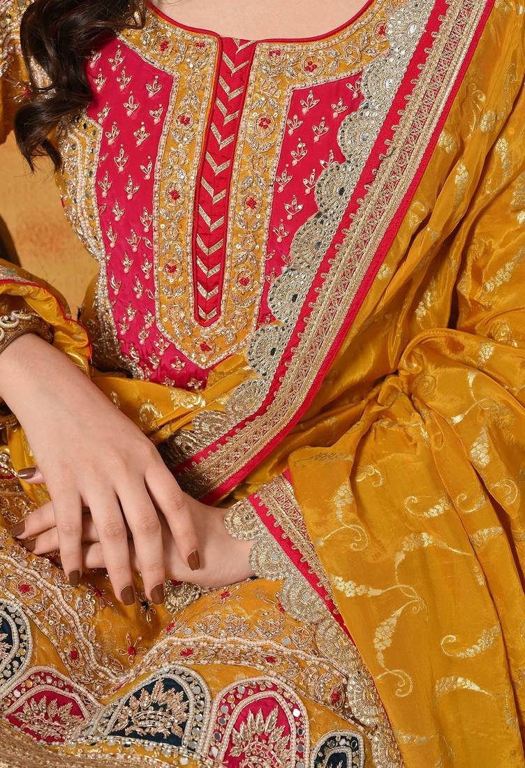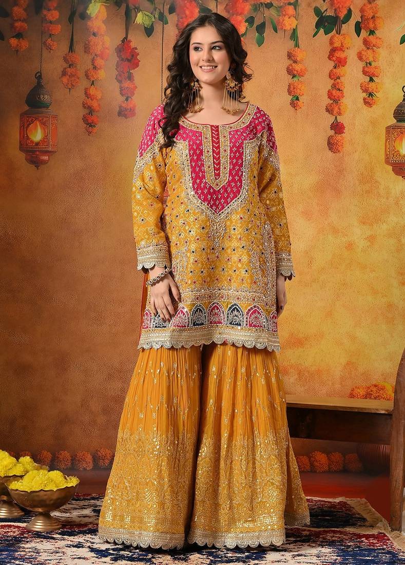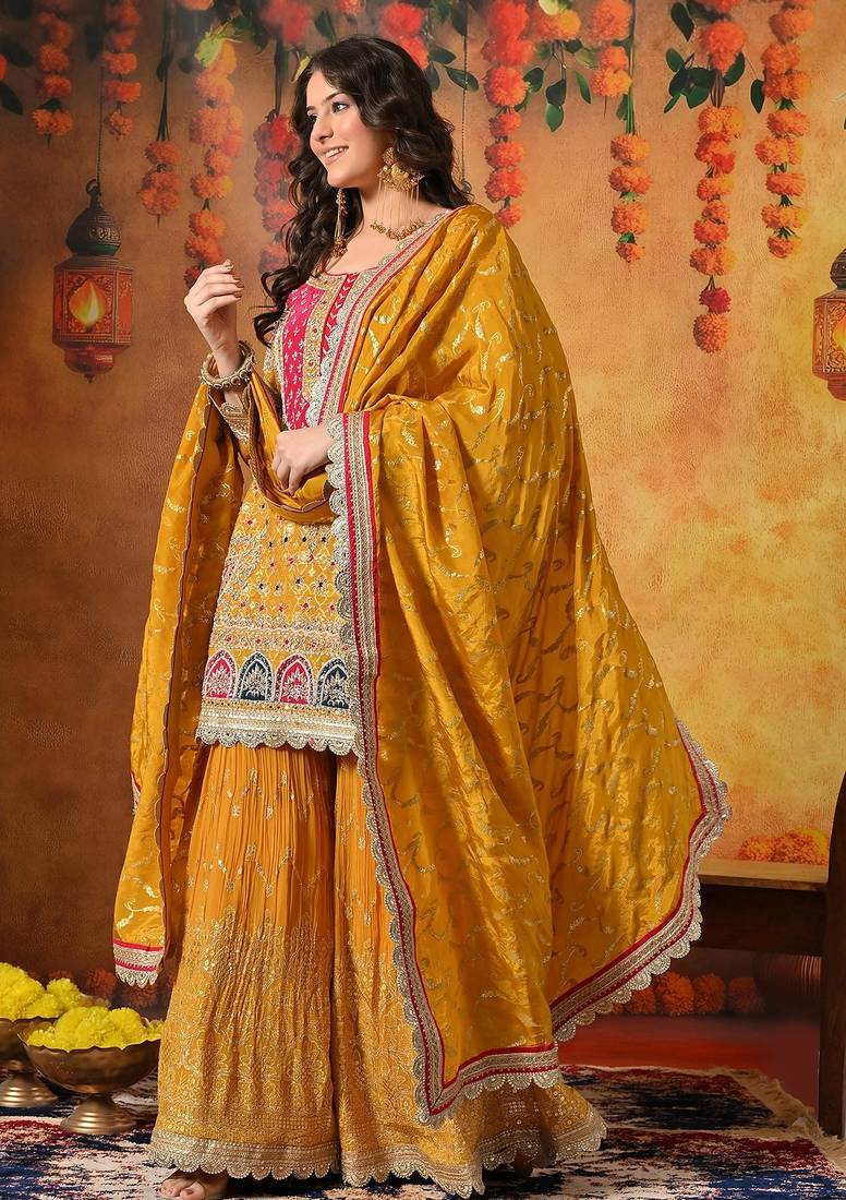 | Product Description | This Opulent Yellow Gharara Set Is Designed To Bring Timeless Elegance And Grandeur To Festive And Wedding Celebrations. Crafted With A Luxurious Blend Of Banarasi Silk And Georgette, The Ensemble Features A Beautifully Tailored Kurti, Flared Gharara, And An Elegant Dupatta, Creating A Regal Traditional Silhouette. |