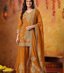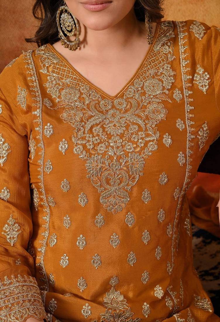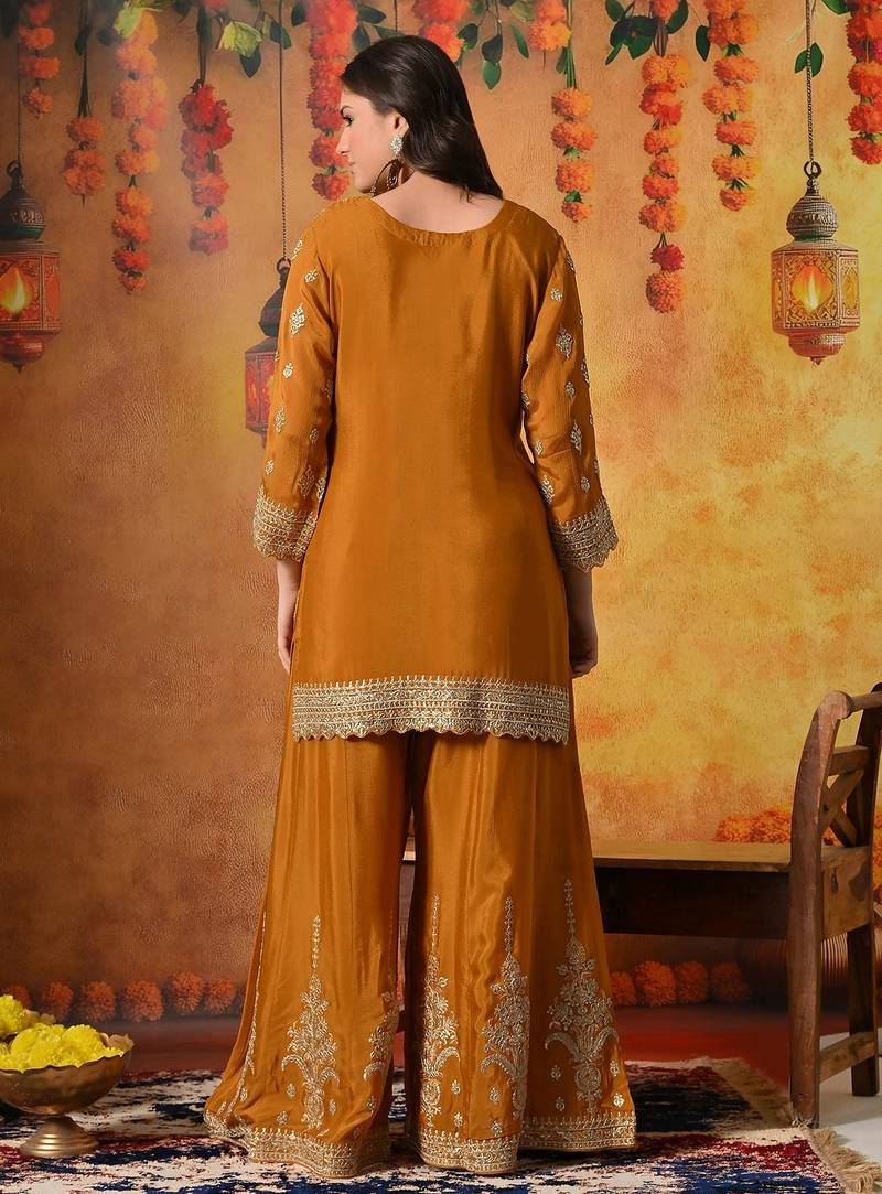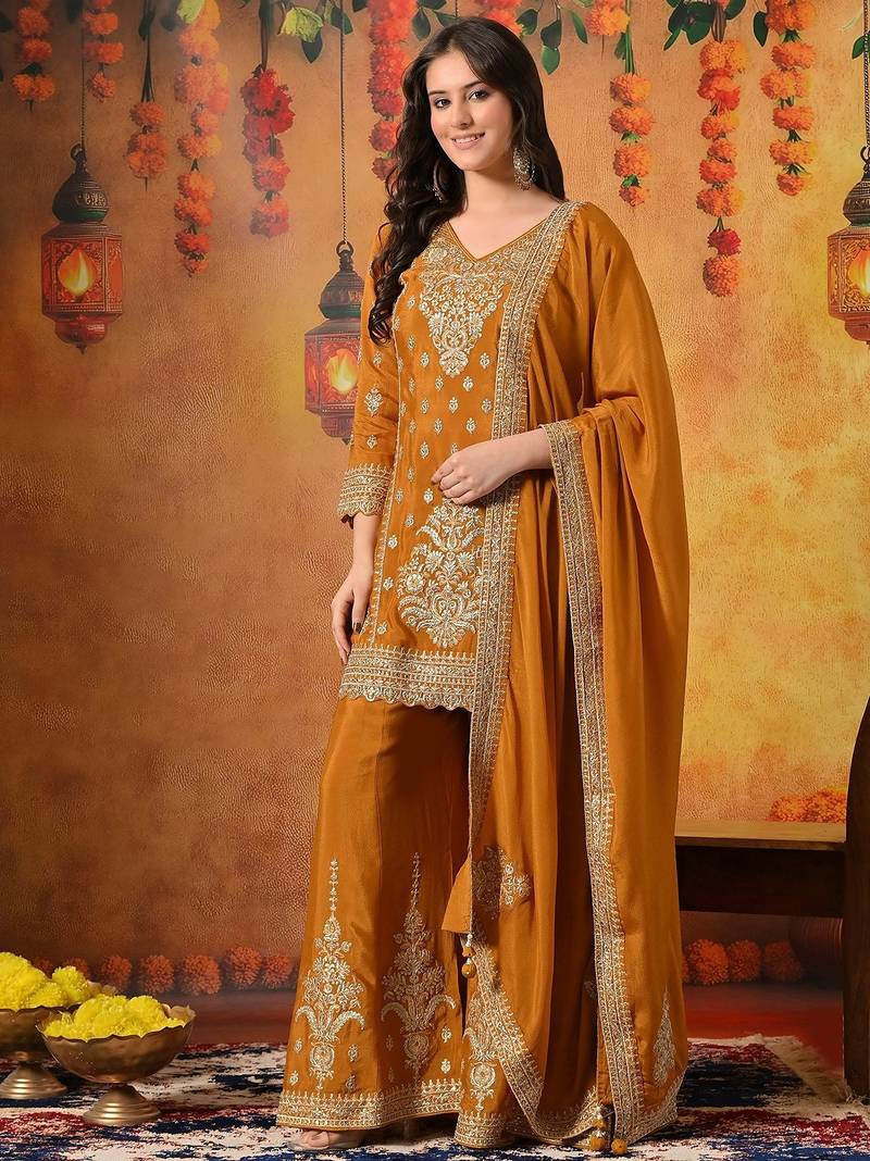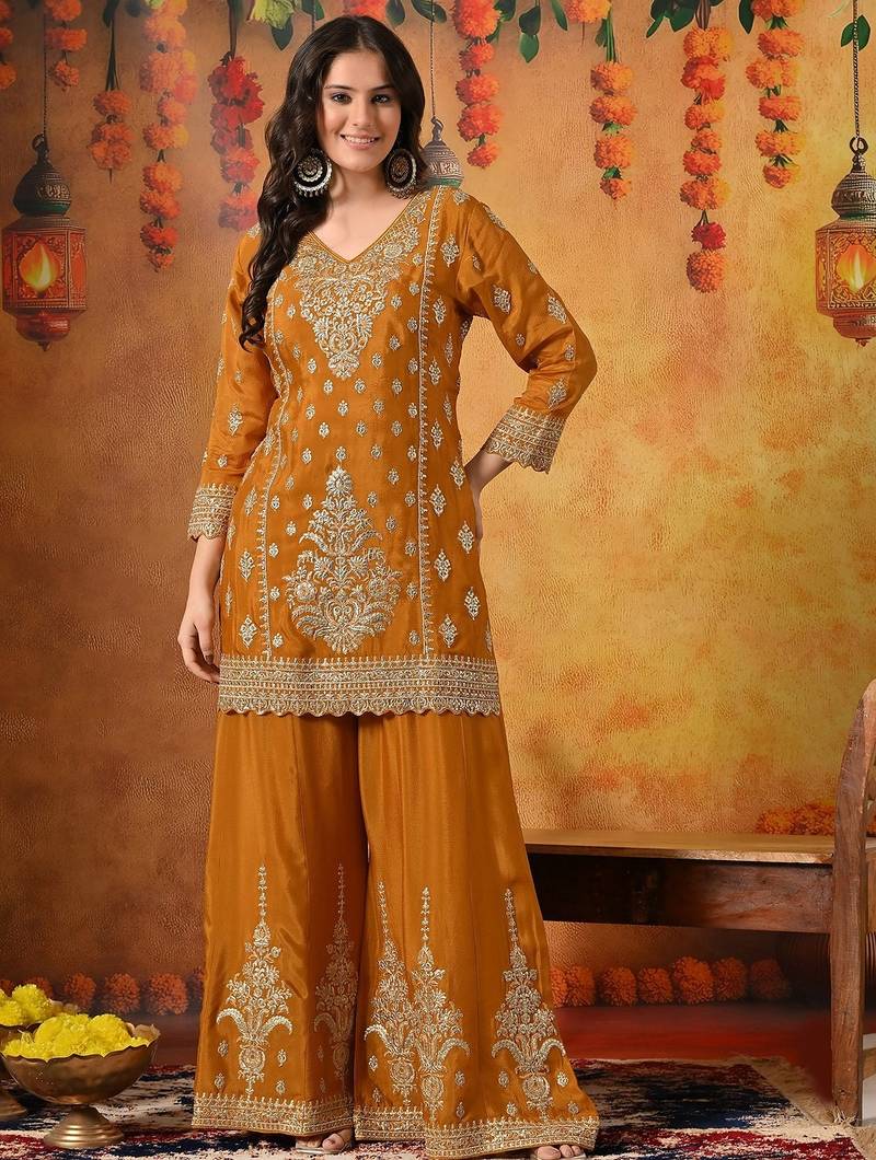 | Product Description | This Radiant Mustard Yellow Sharara Set Beautifully Combines Festive Vibrance With Timeless Craftsmanship. Crafted In Smooth And Flowy Chinon Fabric, The Ensemble Includes An Elegant Kurti, Flared Sharara, And Coordinated Dupatta, Creating A Graceful And Celebratory Ethnic Silhouette. |