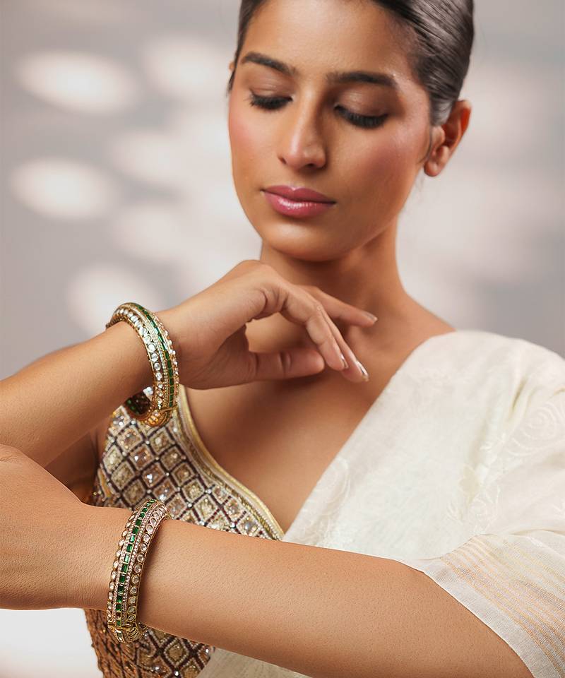 | Product Description | This Two Tone Plated Kundan Green Stone Bangle Exudes Regal Elegance And Traditional Charm. Crafted With Intricate Detailing, It Features Beautifully Set Green Stones Highlighted By A Refined Dual Tone Finish. Perfect For Weddings, Festive Occasions, Or Celebrations, It Adds A Luxurious Accent And Timeless Sophistication To Ethnic And Fusion Ensembles.